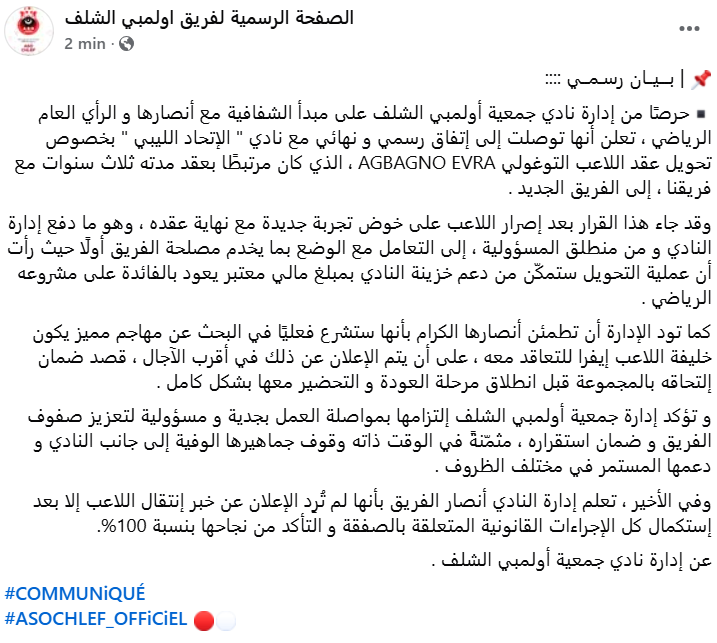 أصدرت إدارة فريق أولمبي الشلف بيانا بخصوص انتقال اللاعب التوغولي إيفرا إلى فريق الاتحاد الليبي.