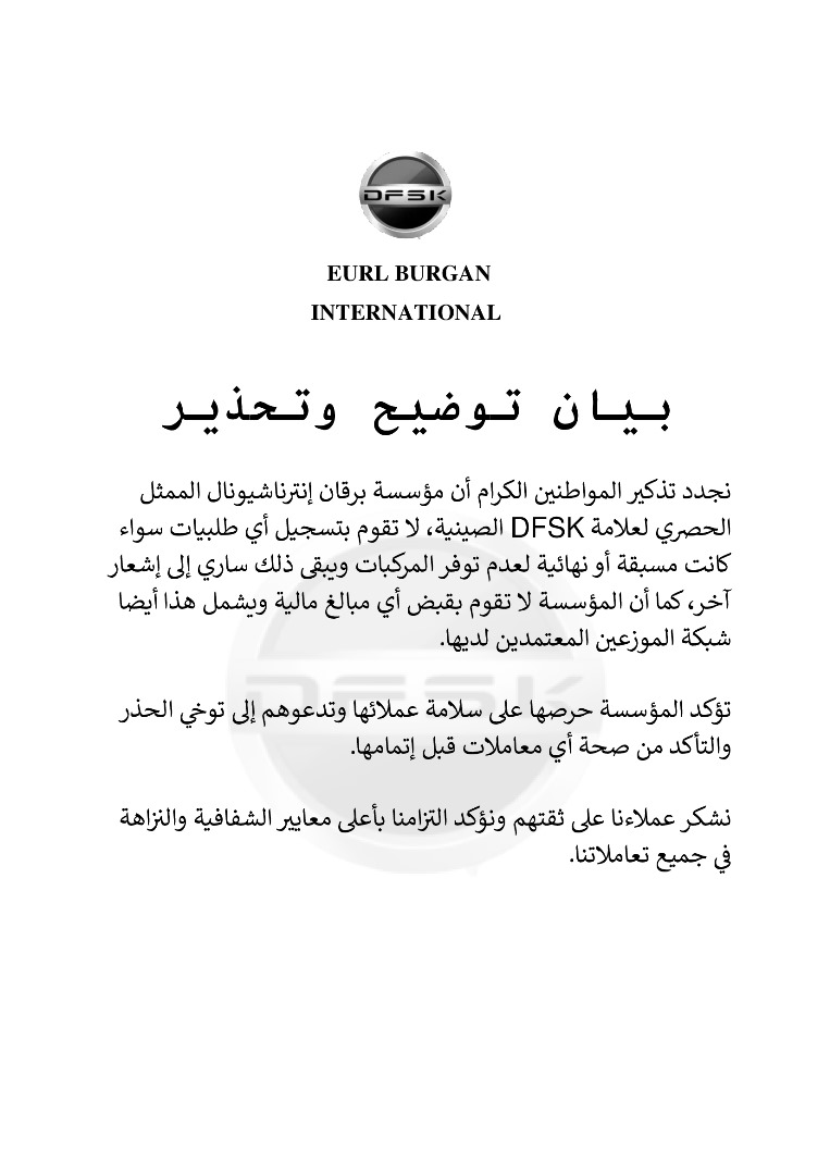 أصدرت مؤسسة برقان إنترناشيونال، الممثل الحصري للعلامة الصينية DFSK في الجزائر، بياناً توضيحياً وتحذيرياً أكدت فيه أنها لا تقوم حالياً بتسجيل أي طلبات شراء للمركبات، سواء كانت طلبات مسبقة أو نهائية، وذلك بسبب عدم توفر المركبات، مشيرة إلى أن هذا الإجراء سيظل سارياً حتى إشعار آخر.
