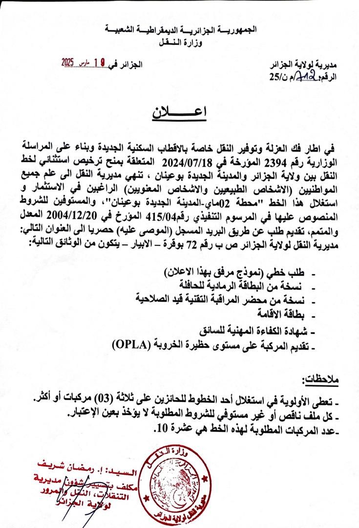 أعلنت مديرية النقل لولاية الجزائر، عن فتح باب الترشح لاستغلال خط نقل جديد يربط بين محطة 02 ماي والمدينة الجديدة بوينان، وذلك في إطار جهود فك العزلة عن الأقطاب السكنية الجديدة وتحسين خدمات النقل العمومي.