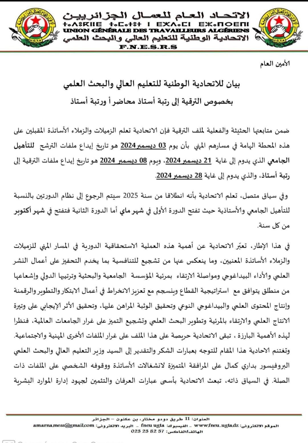 أصدرت الاتحادية الوطنية للتعليم العالي والبحث العلمي، اليوم الأربعاء، بيانًا هامًا يتعلق بالترقية إلى رتبة أستاذ محاضر “أ” ورتبة أستاذ، موجهًا للأستاذة المقبلين على الترشح للتأهيل الجامعي والترقية.