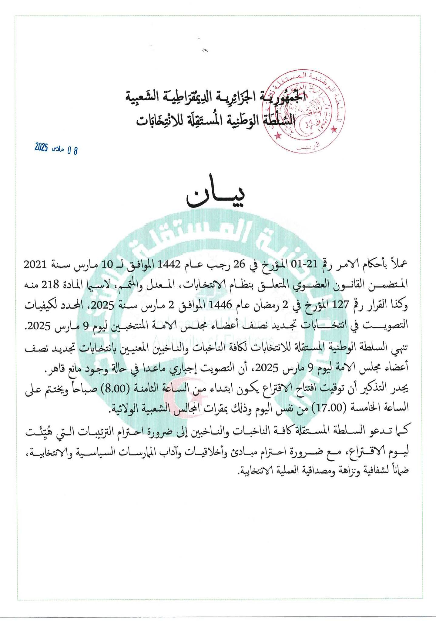 أعلنت السلطة الوطنية المستقلة للانتخابات، السبت، عن الإجراءات التنظيمية الخاصة بانتخابات تجديد نصف أعضاء مجلس الأمة المنتخب، المقررة يوم غد الأحد 9 مارس 2025، وذلك وفقًا لأحكام القانون العضوي المتعلق بنظام الانتخابات.