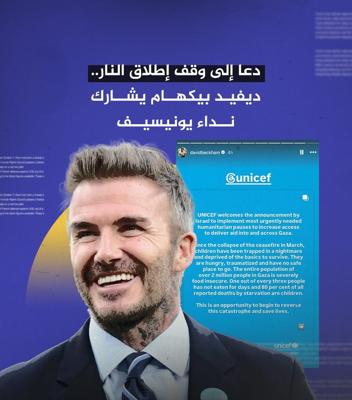وتفاعل الملايين حول العالم مع منشور ديفيد بيكهام، الذي جاء في توقيت حرج، يشهد فيه قطاع غزة تصعيدًا عسكريًا خطيرًا، واستمرارًا للكارثة الإنسانية المتفاقمة، في ظل سياسة تجويع ممنهجة تكاد تقضي على جميع السكان.