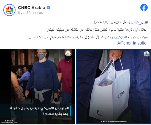 وعلقت الشبكة على الصور أن مؤسس شركة مايكروسوفت يأخذ إلى المنزل حقيبة بها بقايا طعام متبقي من عشائه.
