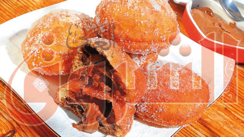ثم ضعي بين كل دائرة و أخرى ملعقة شاي من الشكولاطة، بعد دهن العجينة بالماء حتى تلتصق بسهولة، ثم اقطعي بطابع دائري أصغر من الأول، واتركيهم ليتخمرو مرة ثانية، بعدها إقليهم في زيت ساخن و مرريهم في مربى مخفف بالماء، و بعد ذلك مرريهم في السكر وقدميهم مع الشاي أو القهوة.