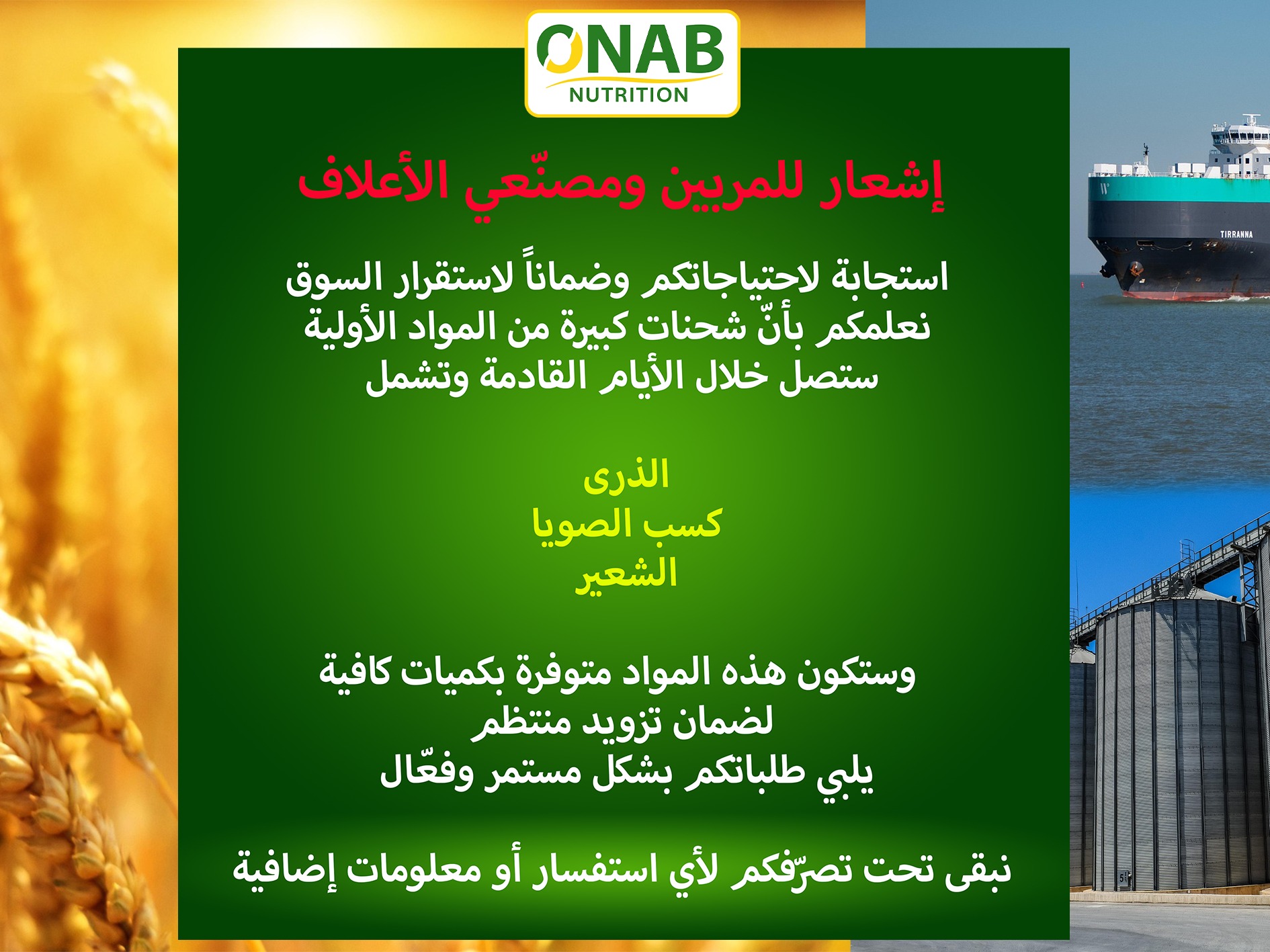أعلن مجمع أوناب، المؤسسة العمومية الاقتصادية المتخصصة في إنتاج الأعلاف وتربية الدواجن، عن استعداداته لتوفير كميات معتبرة من المواد الأولية خلال الأيام المقبلة، استجابة لاحتياجات المربين ومصنّعي الأعلاف وضمانًا لاستقرار السوق.