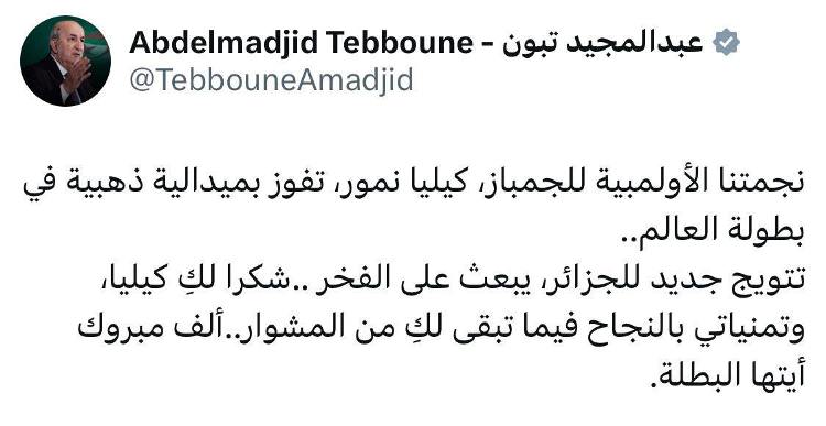 هنّأ رئيس الجمهورية عبد المجيد تبون مساء الأحد، البطلة العالمية في الجمباز كيليا نمور.