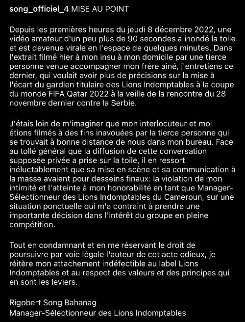 وتداول الشارع الكاميروني، الخميس، عبر مواقع التواصل الاجتماعي شريط فيديو، يُظهر الناخب الوطني ريغوبيرت سونغ يشرح لِأحدهم سبب إبعاد أندري أونانا، ويقول إن حارسه كان يرفض تنفيذ ما يُطلب منه.