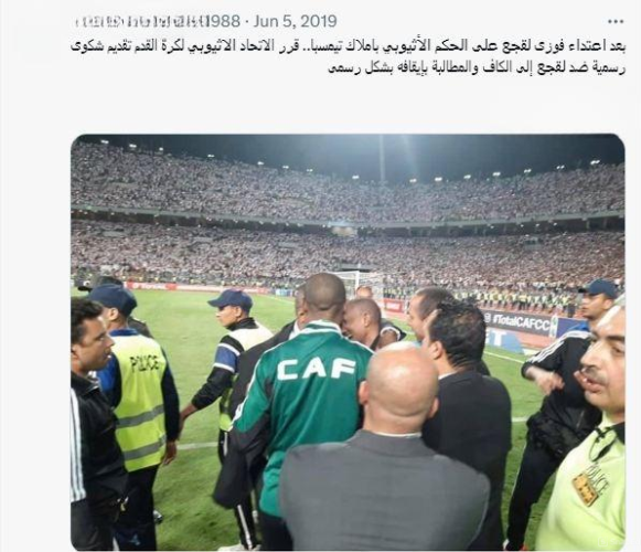 يبقى الآن التساؤل عن صمت المقابر التي تلازمه “الكاف” أمام هذه الحادثة؟ عِلما أن لقجع له سوابق ويملك سجلا أسودَ، حيث اعتدى على حكم الساحة الإثيوبي باملاك تيسيما وييسا (الصورتان المُدرجتان أدناه)، في إياب نهائي كأس “الكاف” عام 2019، بين نهضة بركان (كان يرأس النادي) والمُضيّف الزمالك المصري. وأفلت من العقوبة، بِسبب وقوع رئيس الاتحاد الإفريقي لِكرة القدم أحمد أحمد رهينة لدى النظام المغربي.