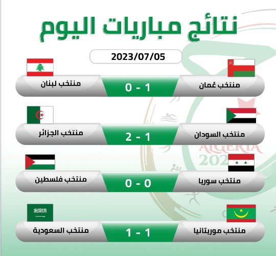 وفي الجولة الثالثة والأخيرة سهرة السبت المقبل، يُواجه تلاميذ الناخب الوطني رشيد آيت محمد نظراءهم من لبنان، بِملعب عنابة. وتتبارى السودان مع منتخب سلطنة عمان، بِميدان “محمد حملاوي” بِقسنطينة.