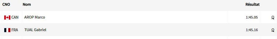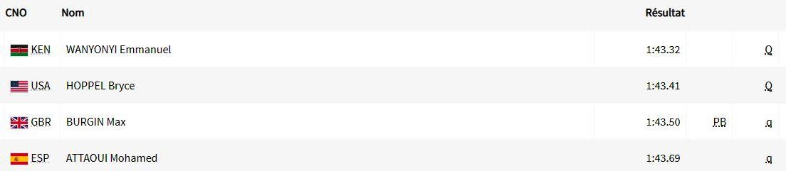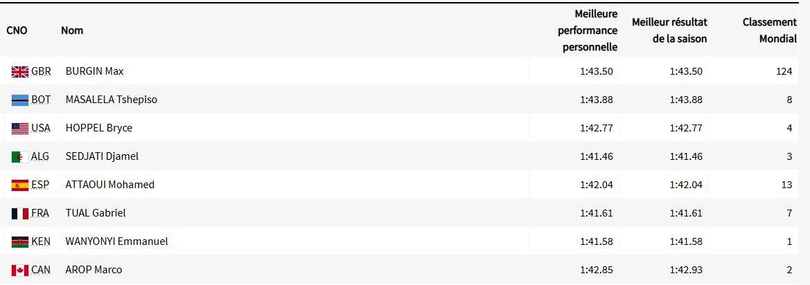 وتُظهر المنشورات الثلاثة المُدرجة أدناه العدّائين الثمانية الذين سيُنشّطون نهائي سباق 800م، بينهم جمال سجاتي. مع توقيت كلّ واحد منهم في نصف النّهائي. بينما يُبرز المنشور الرابع والأخير أفضل نتيجة شخصية وأحسن نتيجة في الموسم والترتيب العالمي، لِكلّ عدّاء.