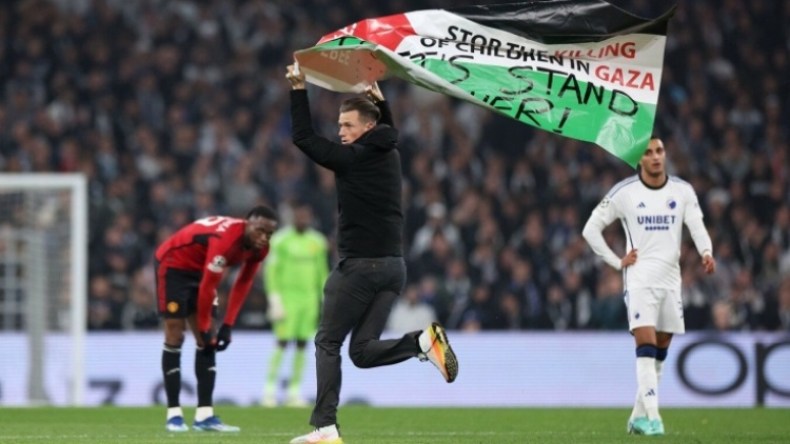 اقتحم مُشجّع أرضية الملعب وهو يحمل علم فلسطين، خلال تنظيم مباراة نادي مانشستر يونايتد الإنجليزي ومُضيّفه فريق كوبنهاغن الدانماركي.