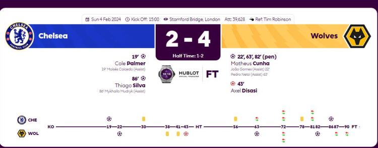 وفاز فريق ولفرهامبتون بِنتيجة (2-4)، في هذه المباراة التي تندرج ضمن إطار الجولة الـ 23 من عمر البطولة الإنجليزية، وأُقيمت فعّالياتها بعد ظهيرة الأحد.