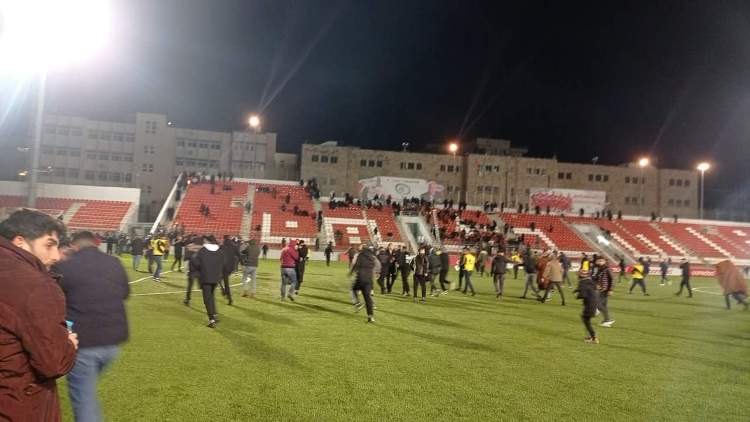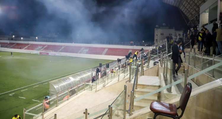 قوات الاحتلال تقتحم ملعب فيصل الحسيني في القدس وتطلق قنابل غاز مسيلة للدموع في المدرجات أثناء مباراة نهائي الكأس في فلسطين بين جبل المكبر بطل الدوري وفريق بلاطة