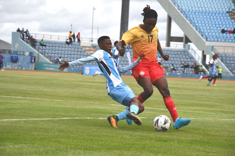 لقطة من مباراة بوتسوانا إناث (بِالزيّ الأزرق والأبيض) والكونغو الديموقراطية.