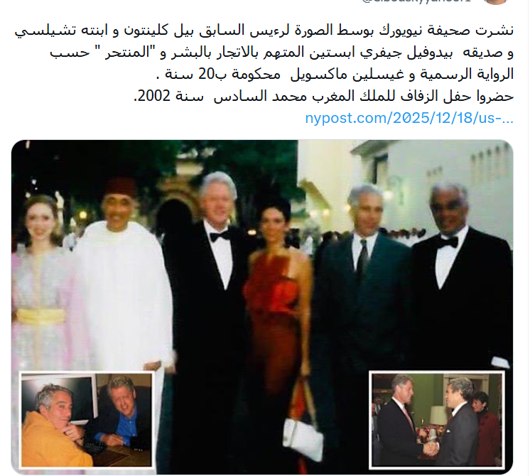 وتُظهر سلسلة من الصور في أحد الألبومات، بدءًا من الصفحة 30، والتي تحمل عنوان “حفل زفاف ملك المغرب”، إبستين وشريكته غيسلين ماكسويل في المغرب، وتحديدا في فعاليات مرتبطة بزفاف الملك، حيث اصطحبهما الرئيس الأمريكي الأسبق، بيل كلينتون.