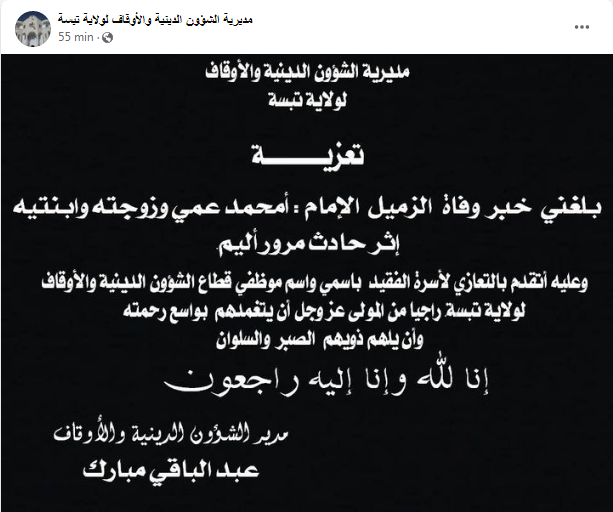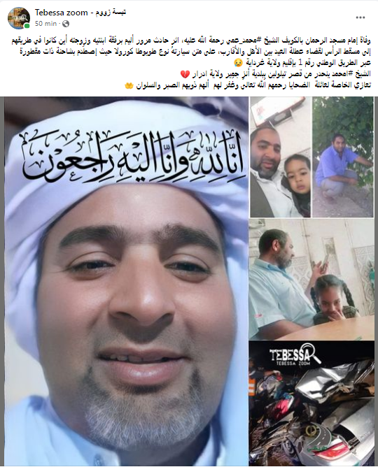 وبحسب ما نشرت مديرية الشؤون الدينية والأوقاف لولاية تبسة فقد توفي الإمام أمحمد عمي وزوجته وابنتيه في حادث مرور أليم.