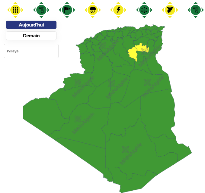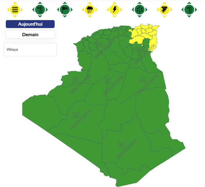 وحسب تنبيه للديوان الوطني للأرصاد الجوية من المستوى الأول باللون الأصفر على خريطة اليقظة، فإن الولايات المعنية بنشاط الخلايا الرعدية والأمطار بداية من الساعة السادسة صباحا من اليوم الأربعاء لغاية الساعة السادسة مساءً من نفس اليوم هي: سوق أهراس، برج باجي مختار، ميلة، أم البواقي، تبسة، قالمة، باتنة، عنابة، سطيف، قسنطينة، سكيكدة، جيجل، الطارف وأدرار.