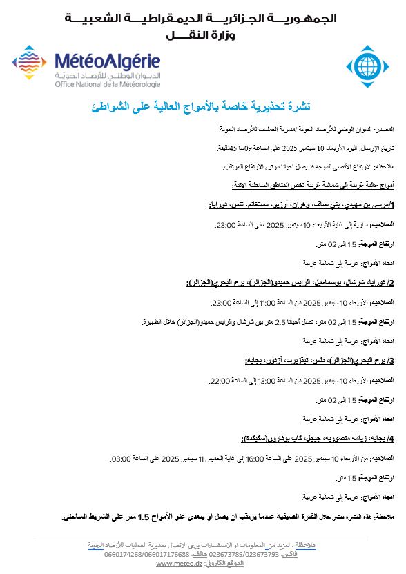 حذّر الديوان الوطني للأرصاد الجوية في نشرية جديدة له حول حالة الطقس، لليوم الأربعاء، من أمواج تتعدى المترين على بعض السواحل من الوطن.