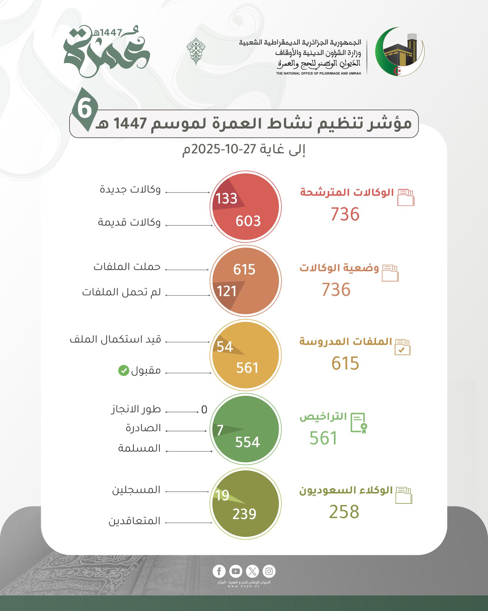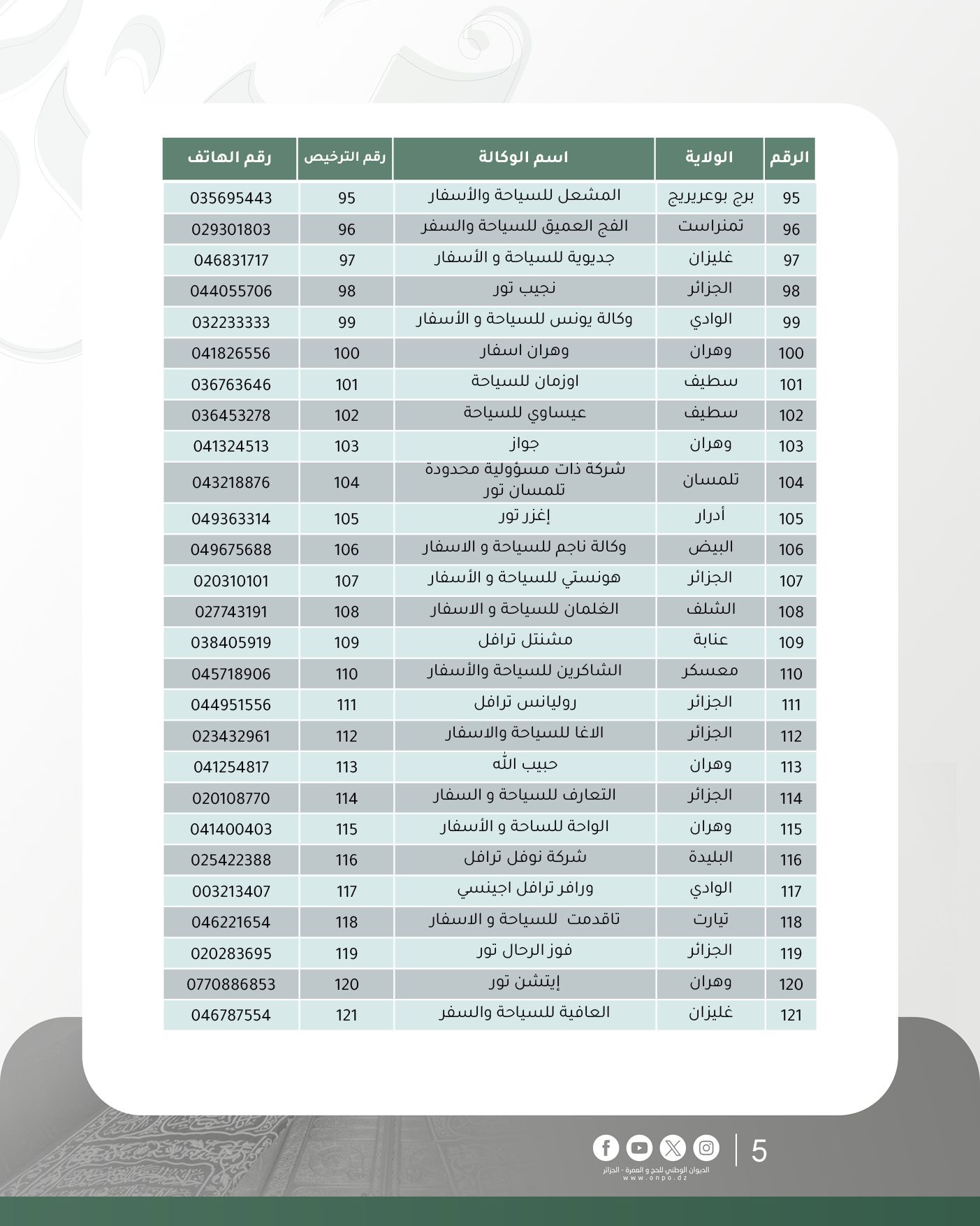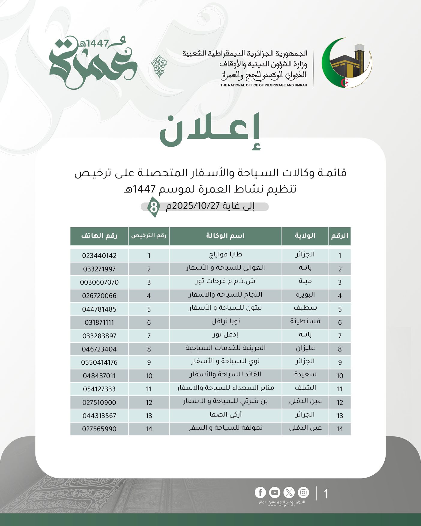 أعلن الديوان الوطني للحج والعمرة عن تحديث جديد لقائمة وكالات السياحة والأسفار المتحصلة على ترخيص تنظيم العمرة لموسم 1447هـ/ 2025م، وذلك إلى غاية 27 أكتوبر 2025.