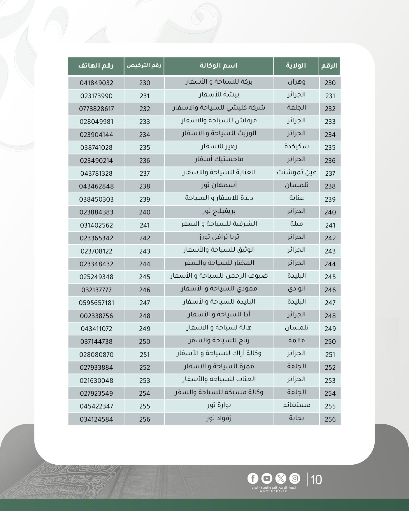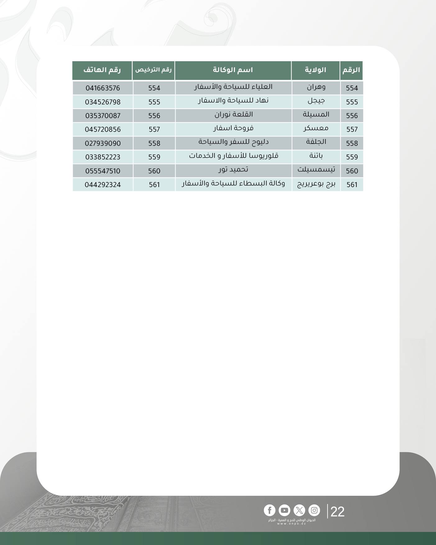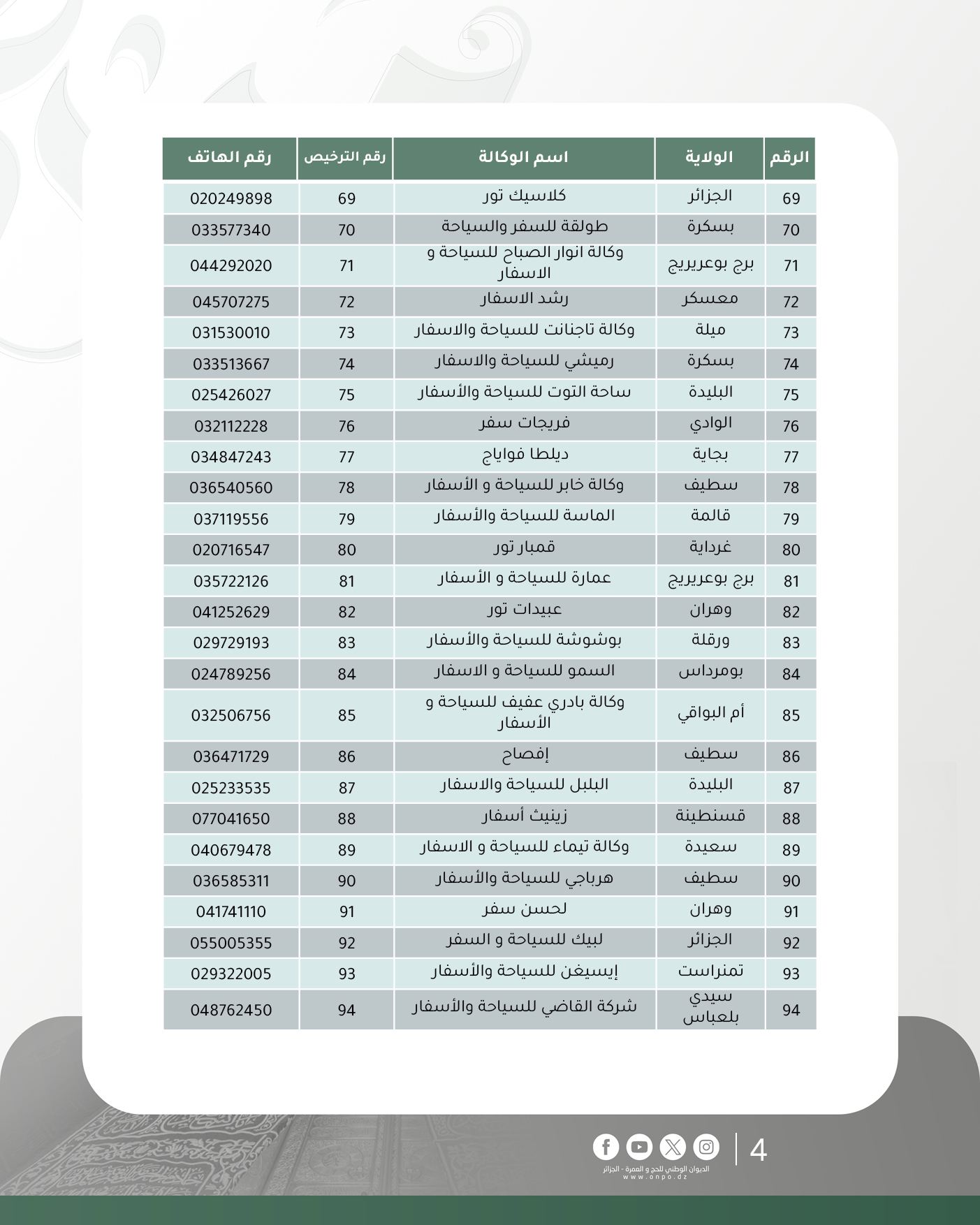 أعلن الديوان الوطني للحج والعمرة عن تحديث جديد لقائمة وكالات السياحة والأسفار المتحصلة على ترخيص تنظيم العمرة لموسم 1447هـ/ 2025م، وذلك إلى غاية 27 أكتوبر 2025.