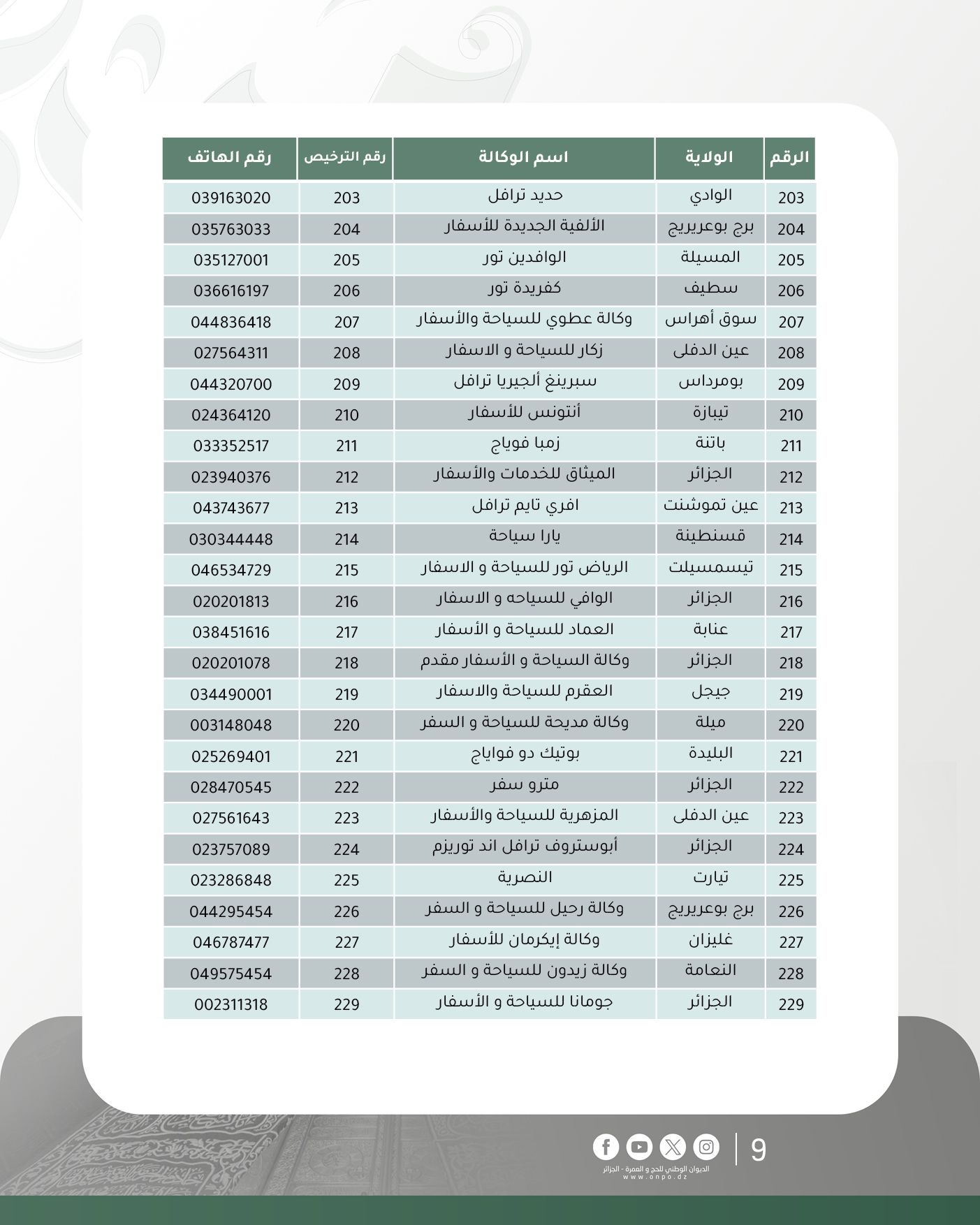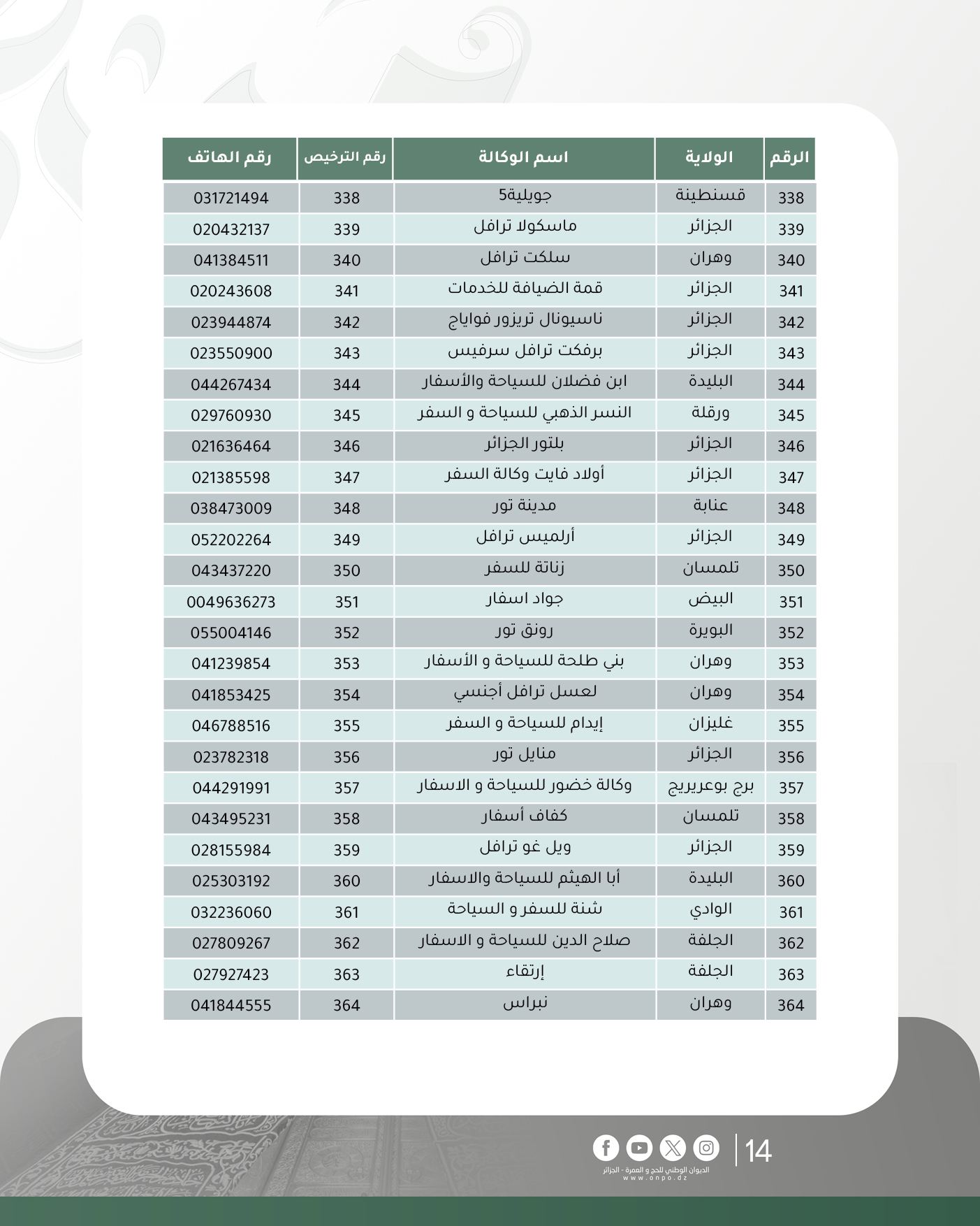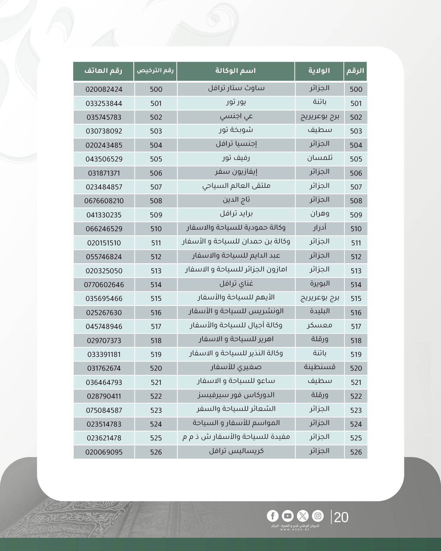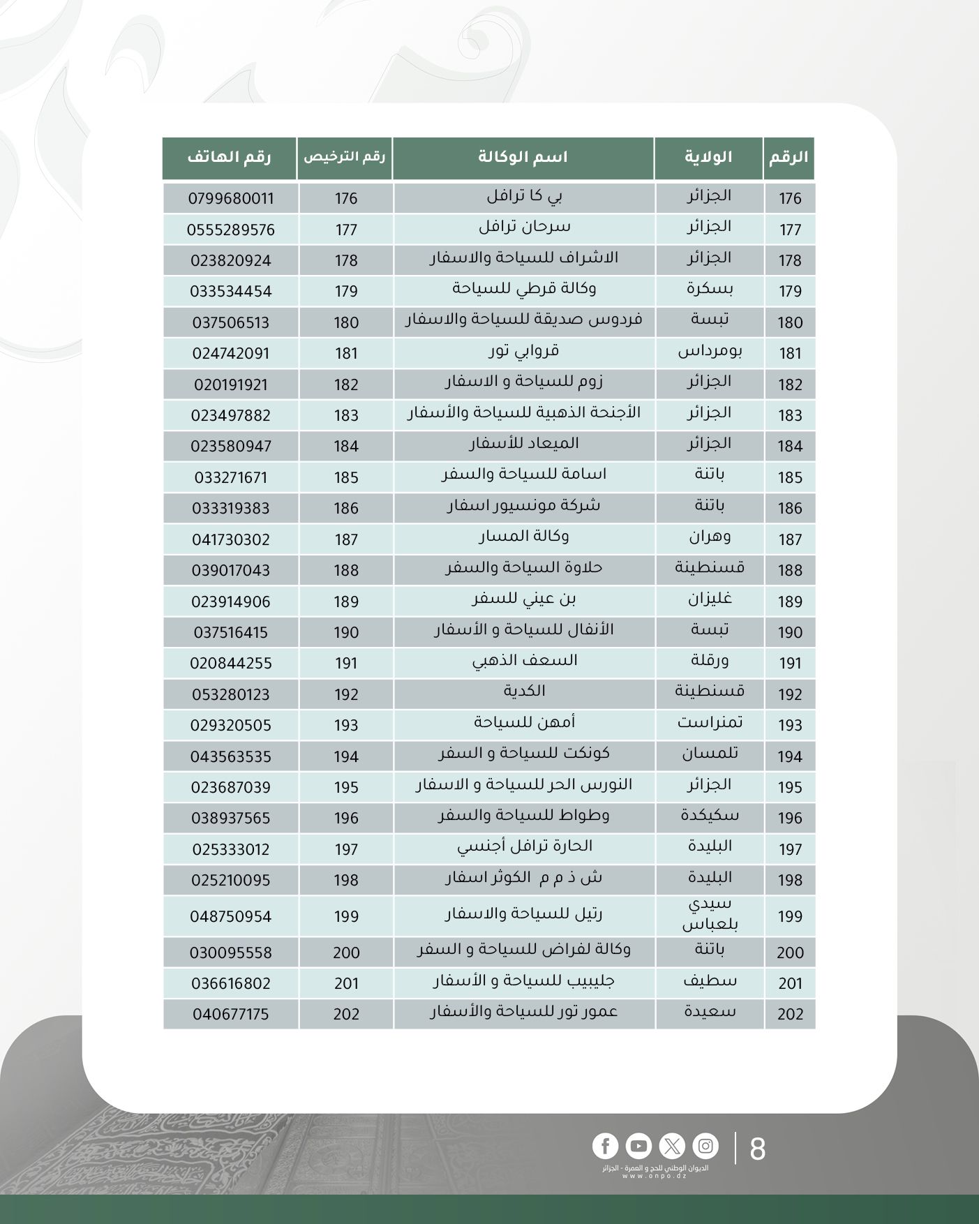 وحسب الديوان، فإن قائمة وكالات السياحة والأسفار المتحصلة على ترخيص تنظيم العمرة لموسم 1447هـ/ 2025م جاءت كالآتي: