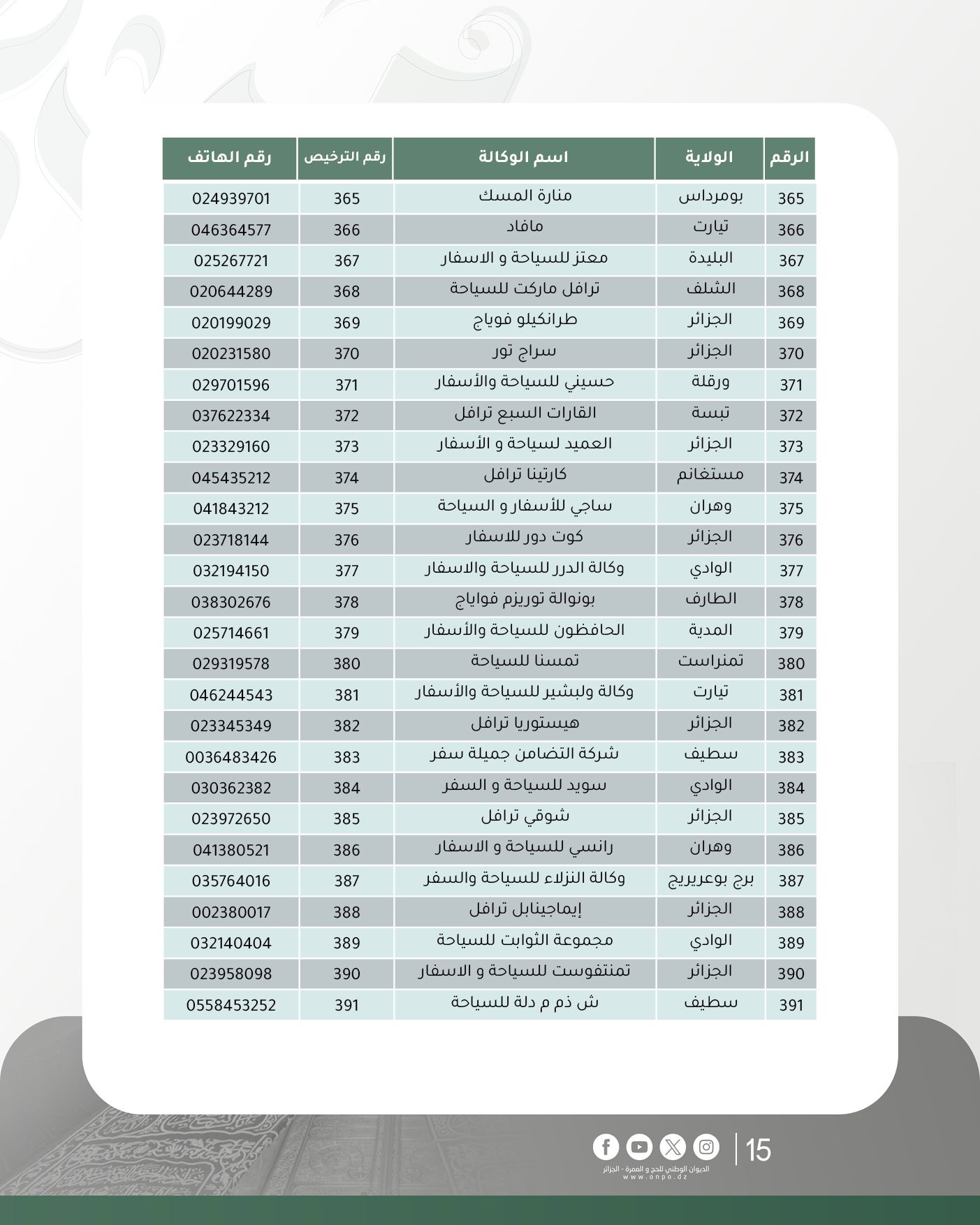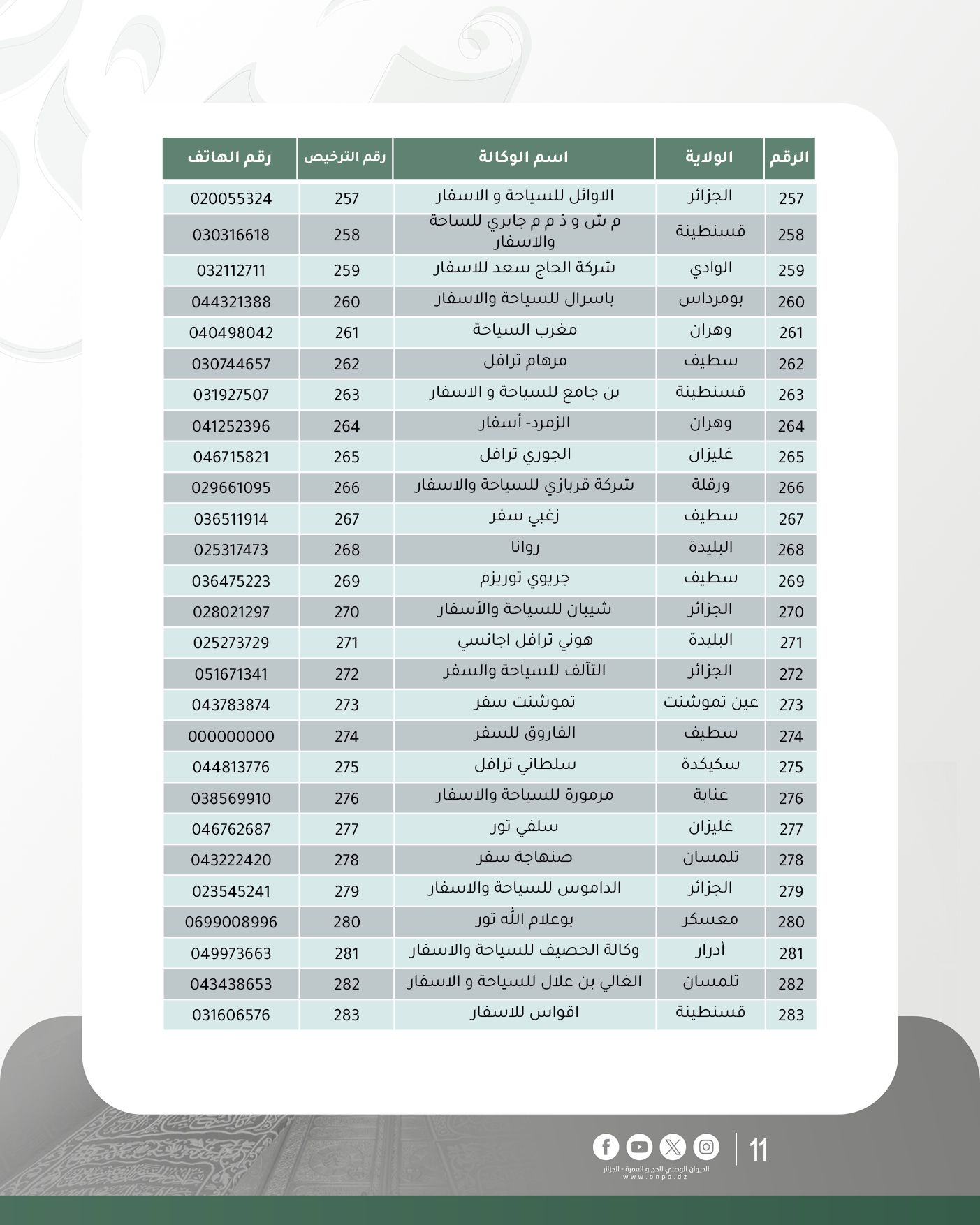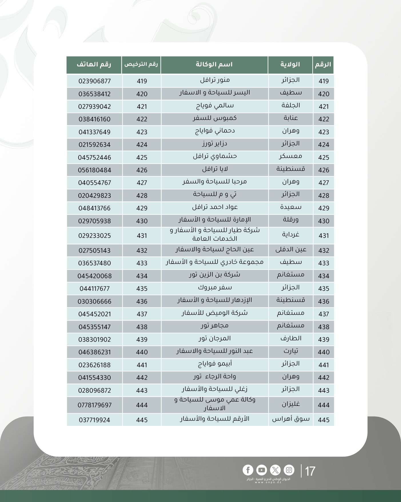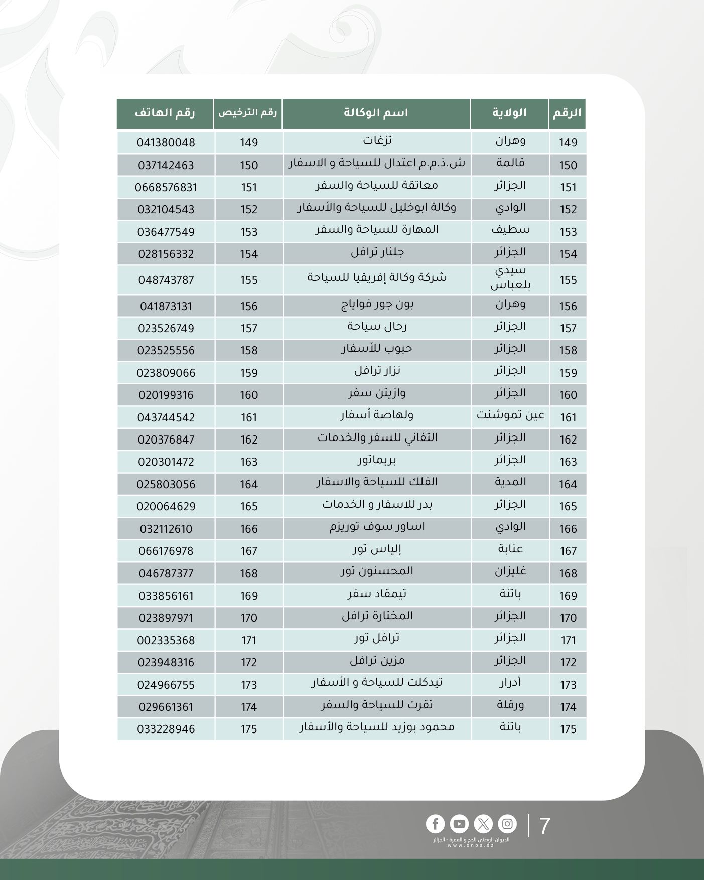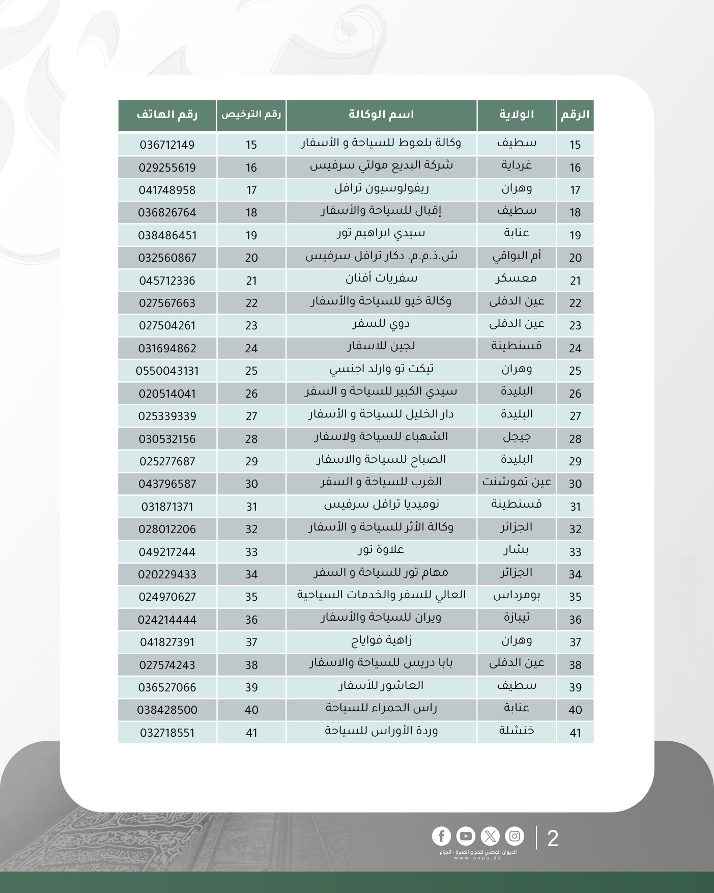 وحسب الديوان، فإن قائمة وكالات السياحة والأسفار المتحصلة على ترخيص تنظيم العمرة لموسم 1447هـ/ 2025م جاءت كالآتي: