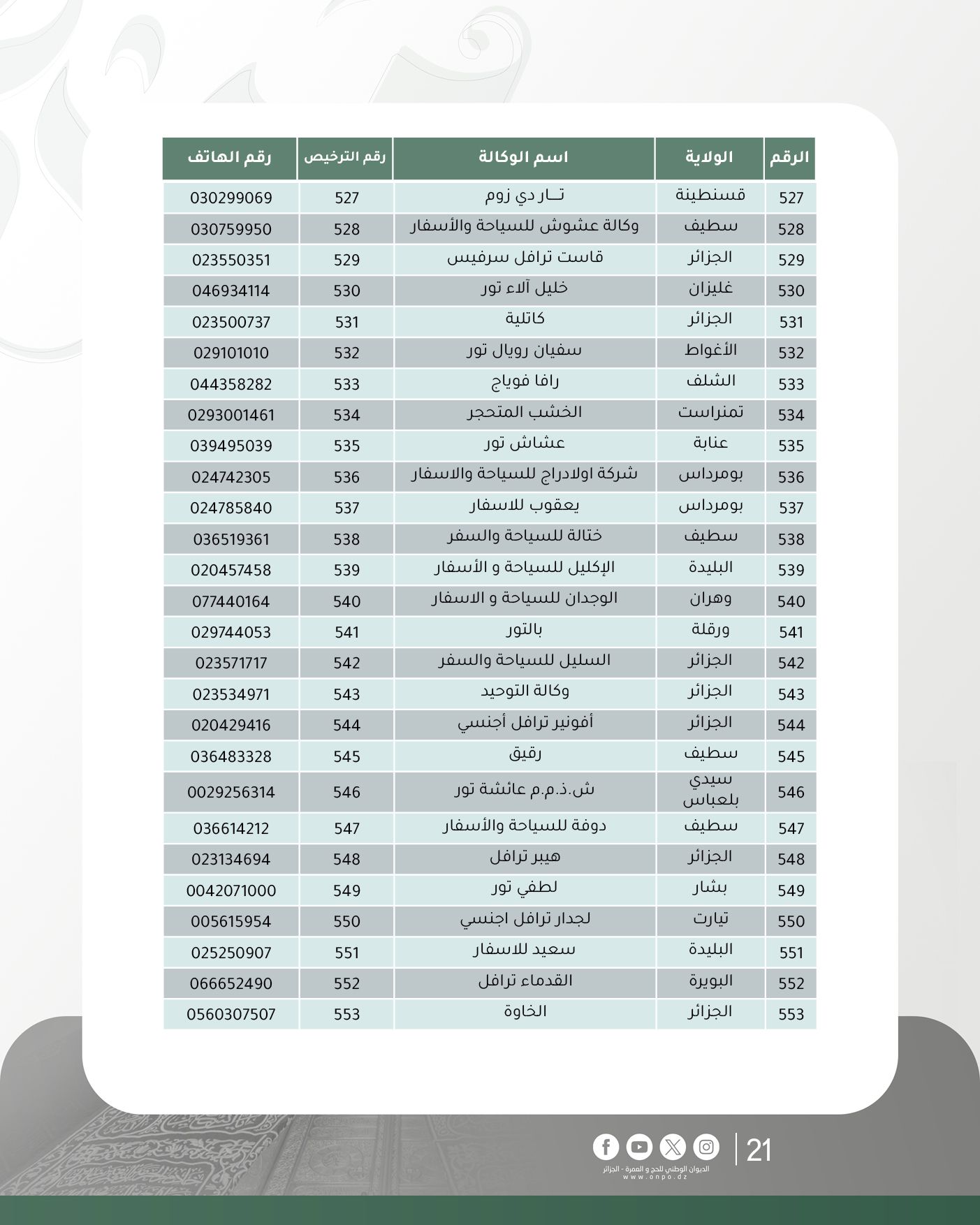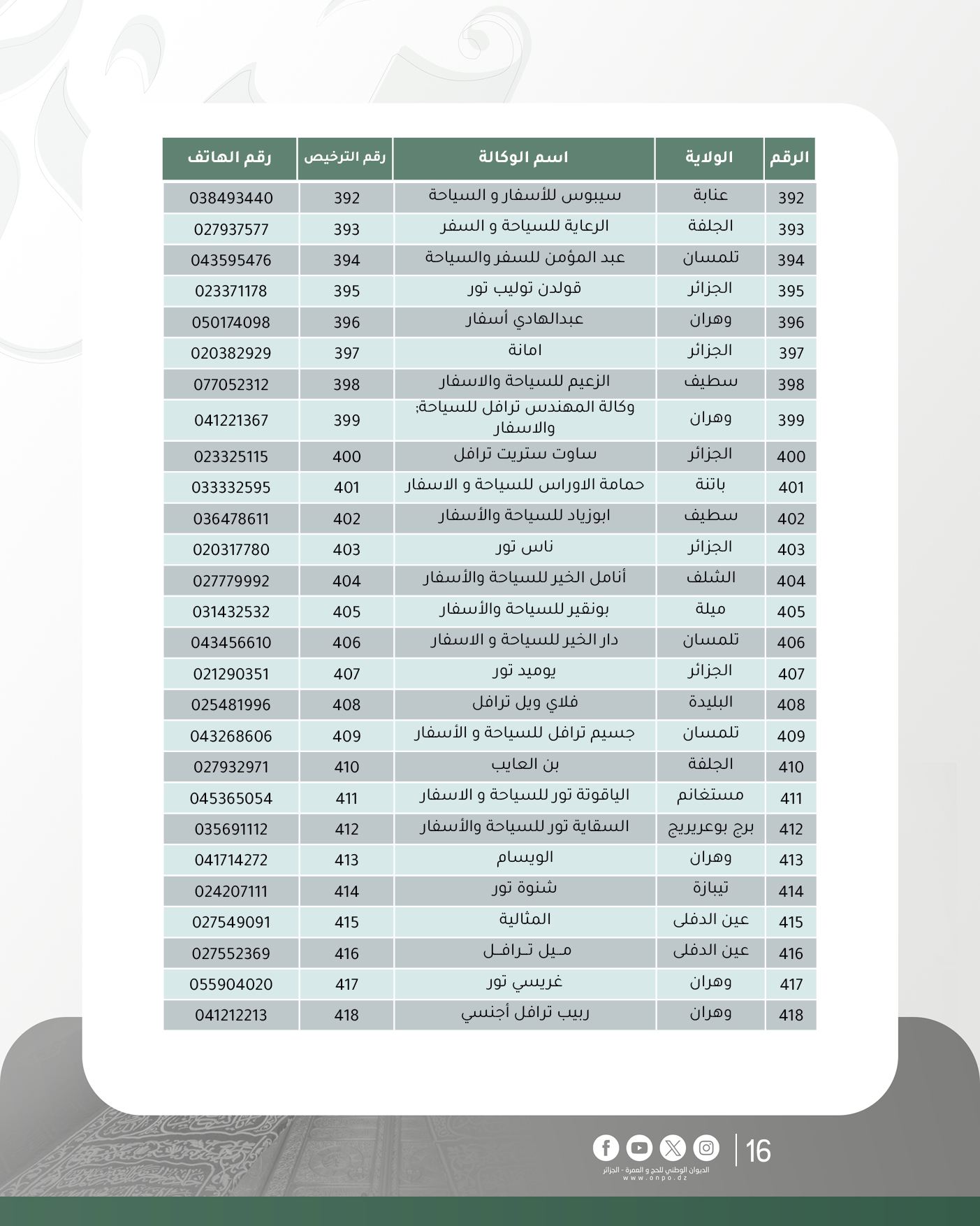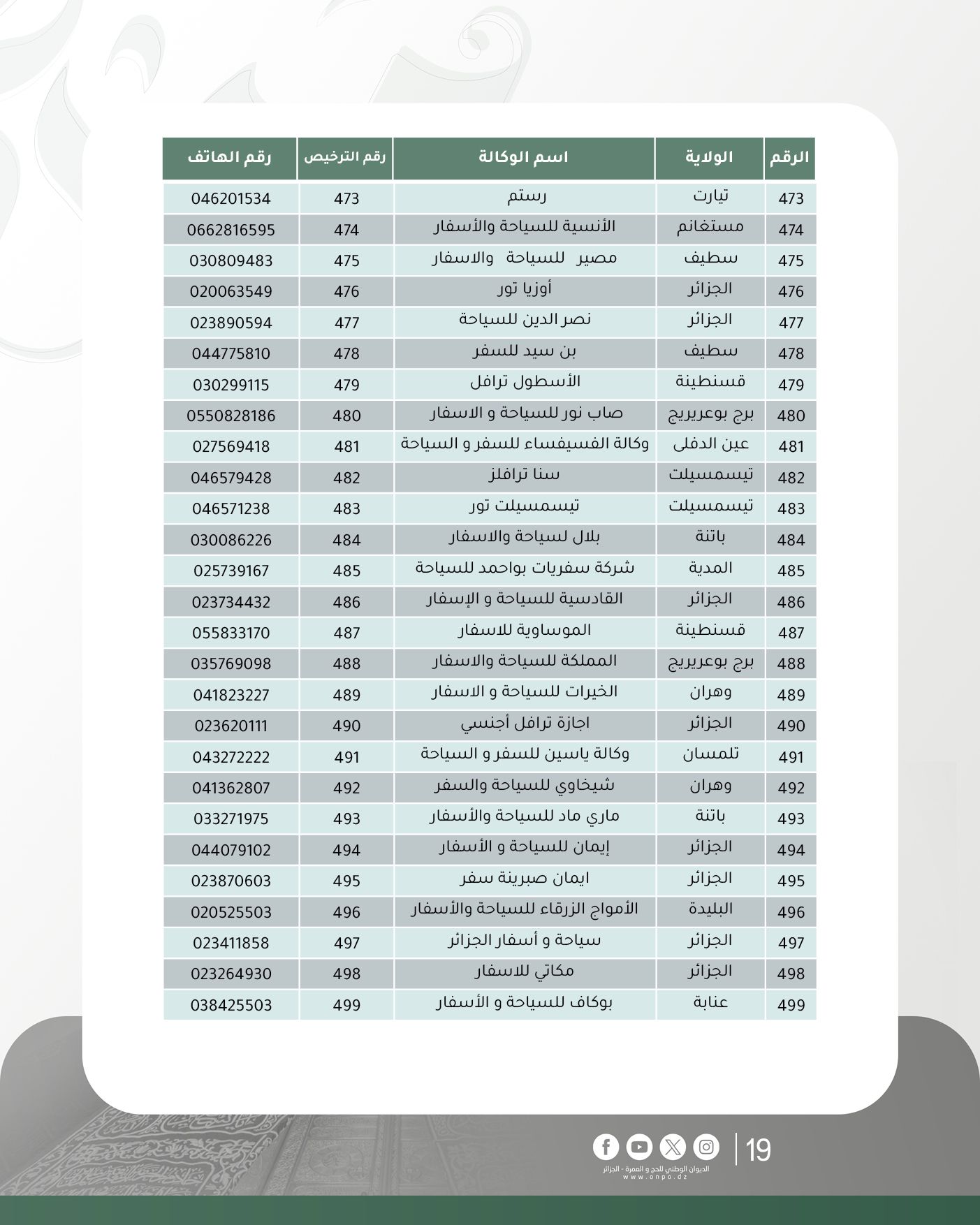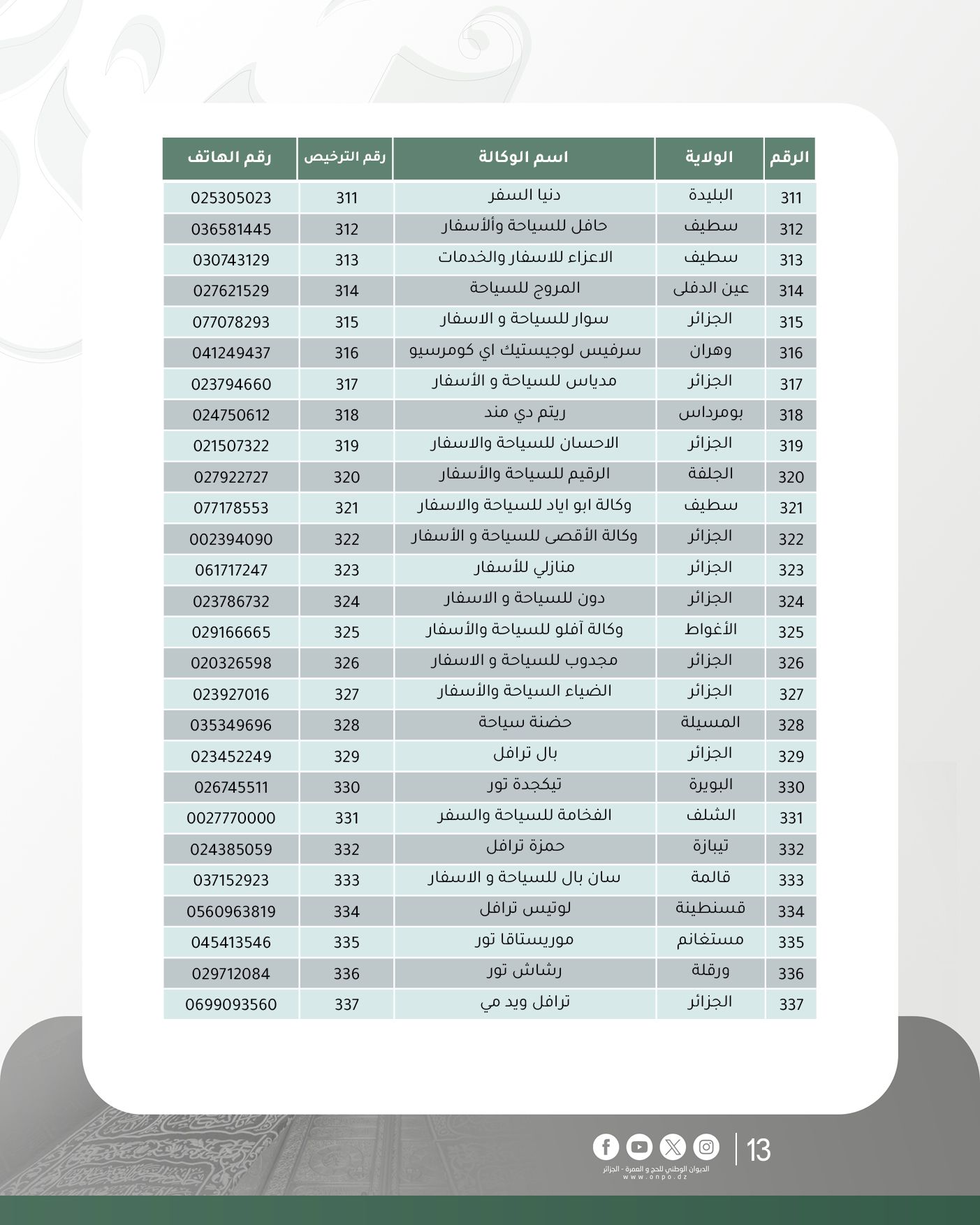 وحسب الديوان، فإن قائمة وكالات السياحة والأسفار المتحصلة على ترخيص تنظيم العمرة لموسم 1447هـ/ 2025م جاءت كالآتي: