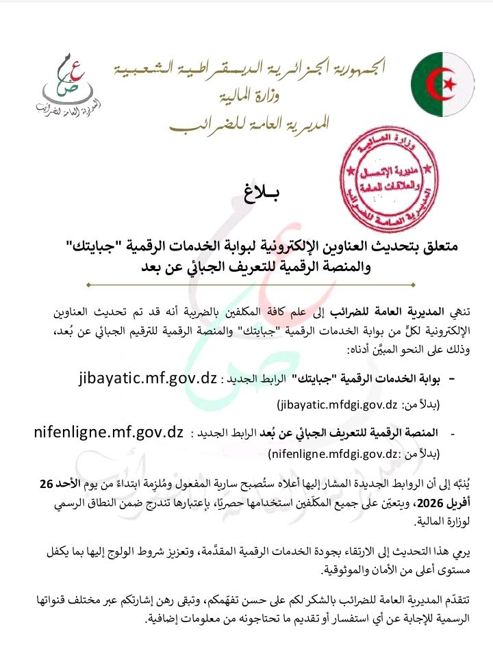 وأوضحت المديرية في بلاغ لها أن التحديث شمل بوابة “جبايتك”، حيث أصبح الرابط الجديد هو: jibayatic.mf.gov.dz بدلًا من jibayatic.mfdgi.gov.dz، إضافة إلى منصة التعريف الجبائي عن بُعد التي أصبح رابطها الجديد: nifenligne.mf.gov.dz بدلًا من nifenligne.mfdgi.gov.dz.