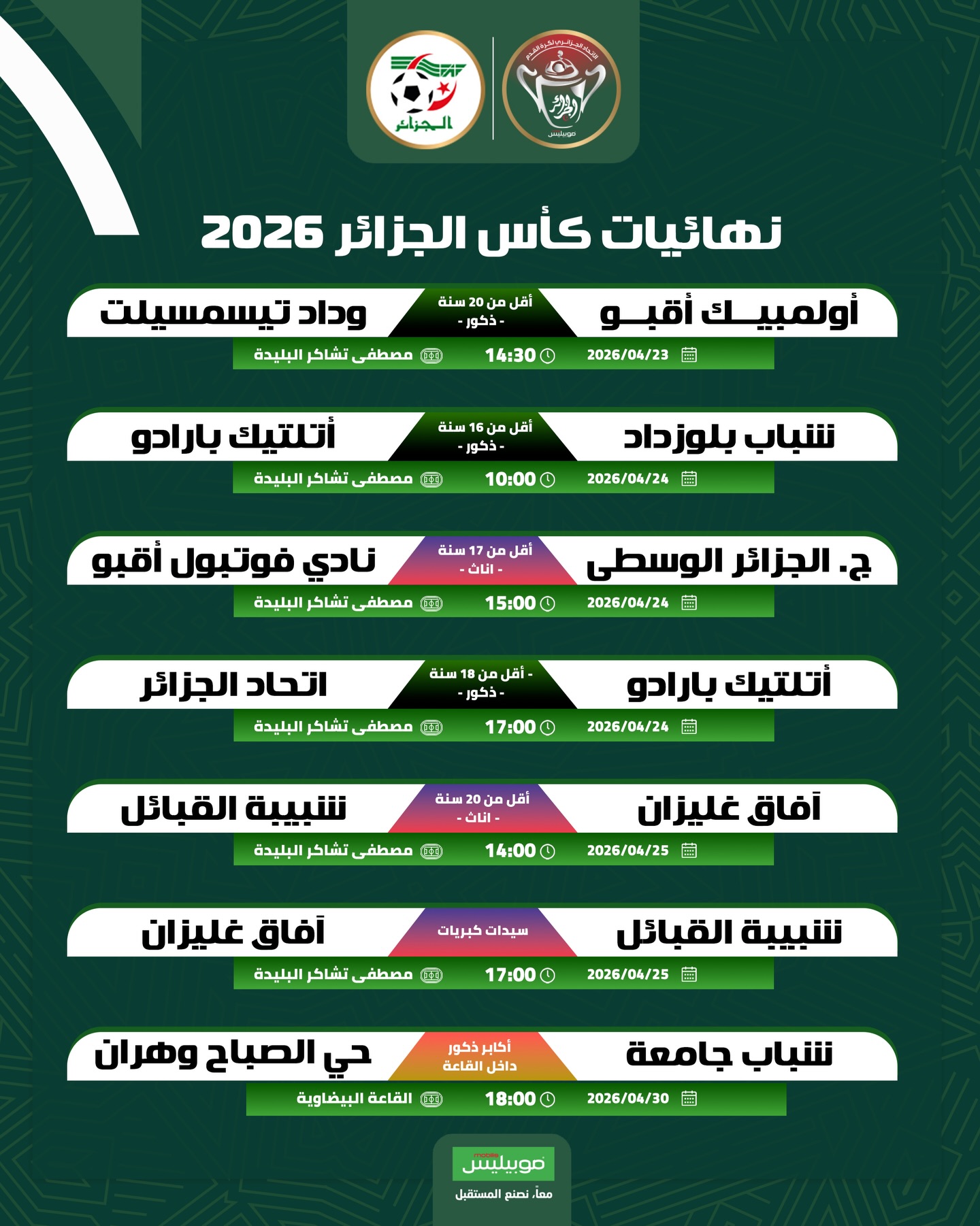 ويلعب نهائي أقل من 17 سنة إناث، بين جمعية الجزائر الوسطى ونادي فوتبول أقبو، يوم 24 أفريل بداية من الثالثة زوالا.
