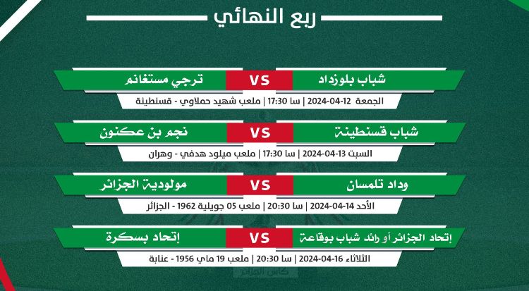 ضبط اتحاد الكرة الجزائري مساء الثلاثاء، مواقيت مواجهات ربع نهائي منافسة كأس الجمهورية.