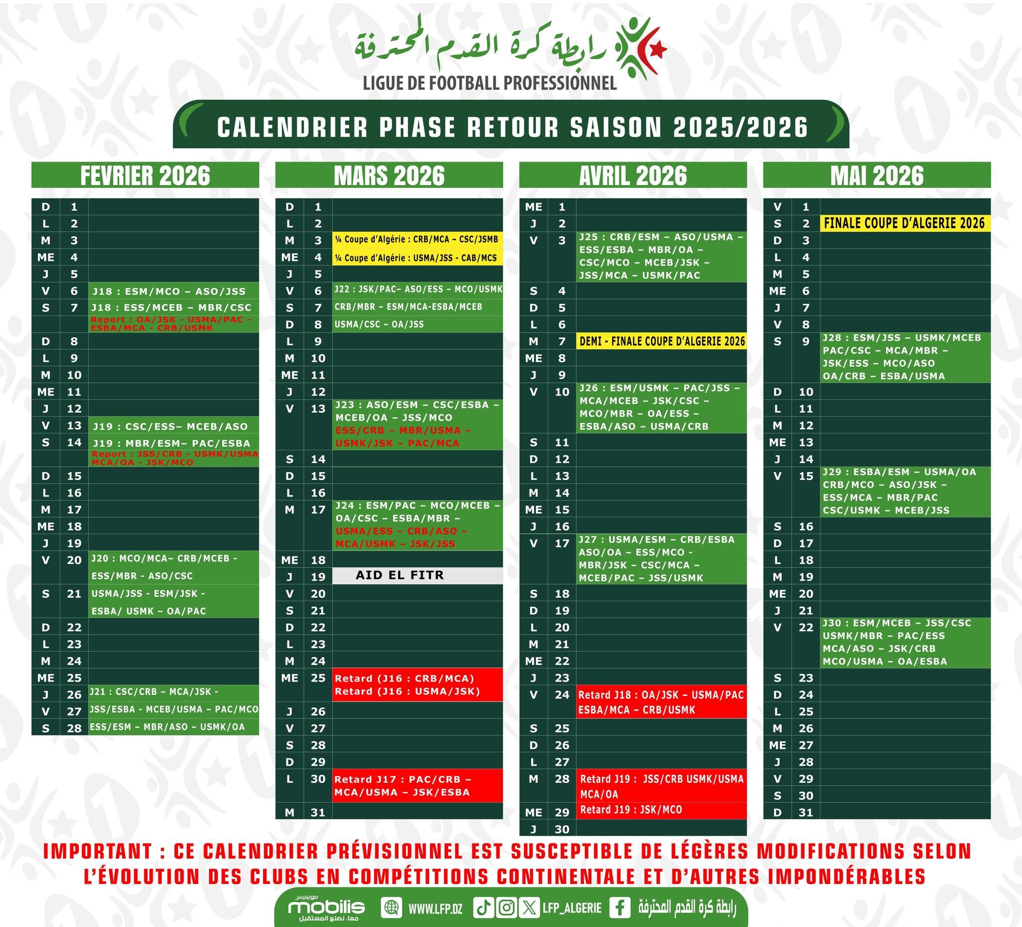 كشفت رابطة كرة القدم عن البرنامج الكامل لمرحلة العودة من الرابطة المحترفة الأولى، وكذا الأدوار المتبقية من منافسة كأس الجزائر 2026.