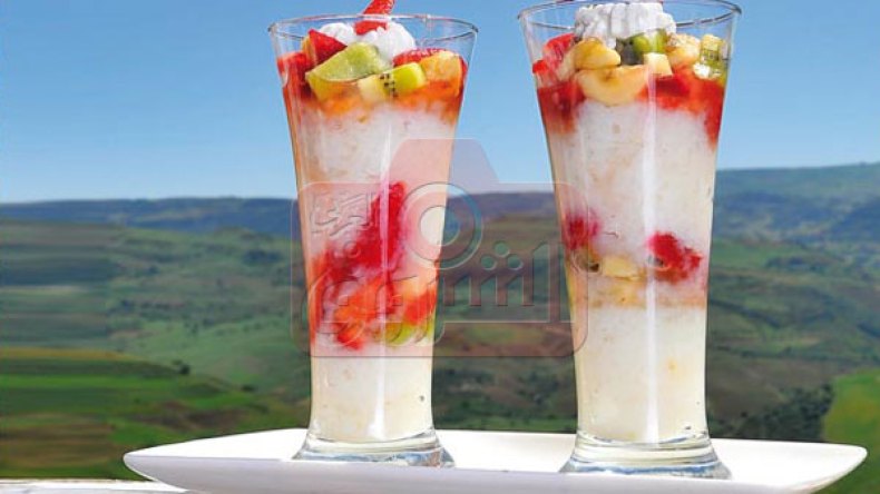 في كأس طويلة ضعي طبقة من الأرز ثم طبقة من الفواكه و كرري العملية حتى يمتلئ الكأس و زيني بالكريمة و الفراولة.