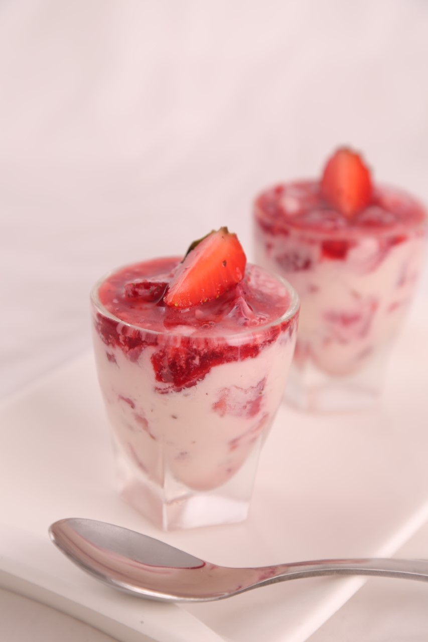 في قدر نضع الحليب ونضيف له السكر والبيض المخفوق والمايزينة والحليب المركز المحلى ونخلط جميع المقادير جيدا، ثم نضع القدر على النار مع التحريك حتى نتحصل على كريمة، ثم ننزع الكريمة من النار ونتركها تبرد قليلا، ثم نضيف لها الفراولة المقطعة إلى قطع صغيرة ونضعها في قوالب تقديم ونزينها من فوق بقطع من الفراولة ثم ندخلها الثلاجة لتبرد (أنظري الصورة).