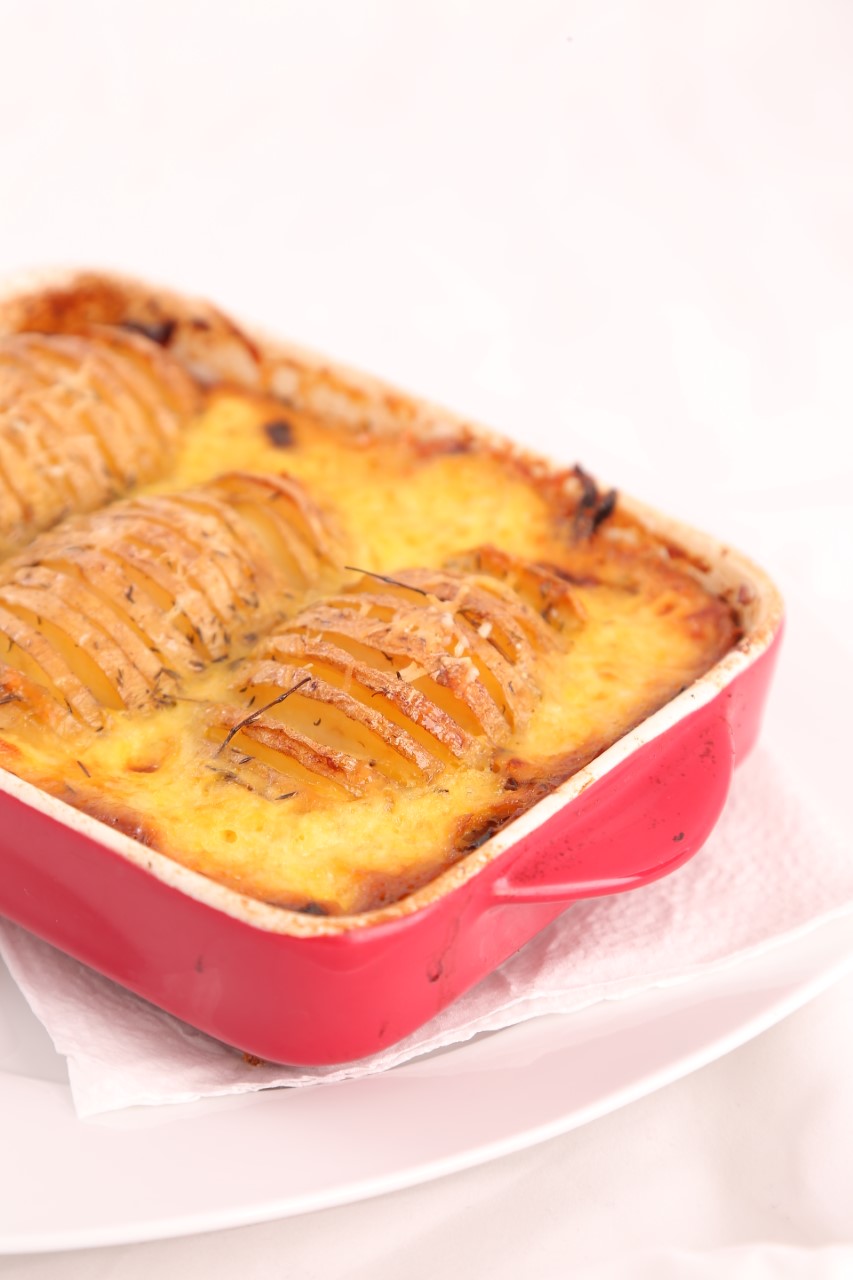 ندهن القالب بالزبدة ثم نضع البصل والدجاج ونضع فوقها حبات البطاطا بالقشرة المقطعة بالعرض الى شرائح بحيث تبقى البطاطا متماسكة من اسفلها، ثم نرشها بجميع التوابل ونضع فوقها قطع الزبدة ونغطي القالب بورق الالمنيوم وندخلها الفرن، في هذا الوقت نخلط البيض المخفوق والحليب والقشدة والجبن المبشور وقليل من الملح، عندما تنضج البطاطا نخرجها من الفرن ونسكب عليها الخليط الذي حضرناه، ثم ندخلها مرة اخرى للفرن لكي يتجمد الخليط وتتحمر البطاطا (أنظري الصورة).