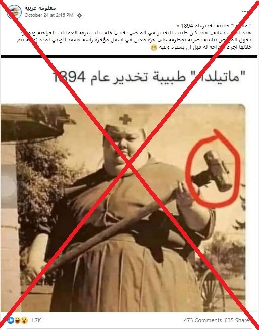 وجاء في التعليق المرافق: “ماتيلدا طبيبة تخدير عام 1894″ وادّعى مروّجو المنشور أنّ أطباء التخدير آنذاك كانوا يباغتون المريض بضربة مطرقة على نقطة محدّدة في رأسه ليفقد وعيه وبعدها يخضعونه للعمليّة الجراحيّة.