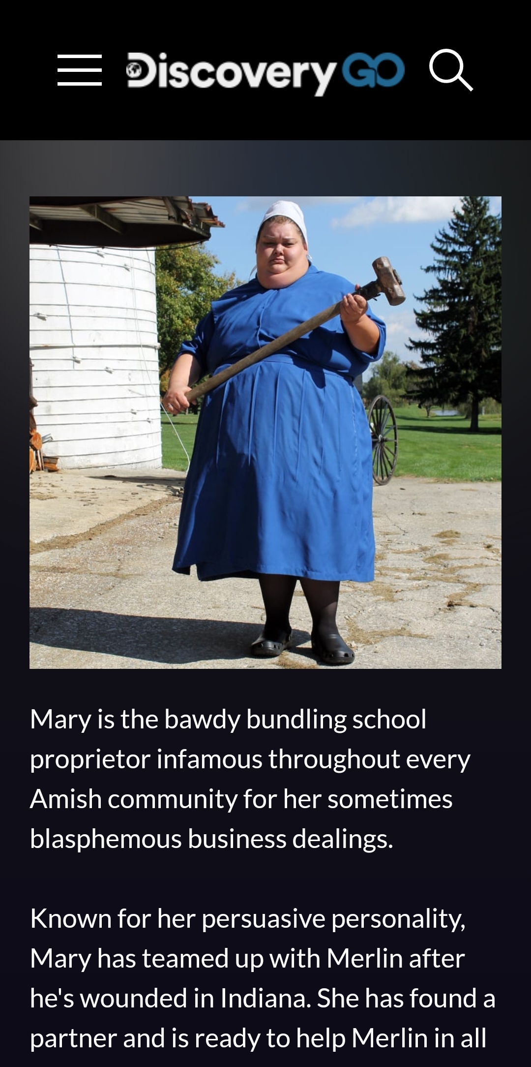 وجاء في الوصف المرافق للصورة على الموقع أنّ السيّدة هي ممثّلة في برنامج Amish mafia، وتلعب دور صاحبة مدرسة تُدعى ماري وتُعرف بسمعتها السيئة. وقد تعمّد ناشرو الصورة تغيير ألوانها لتبدو قديمة وإضافة القبّعة ليبدو أنّها طبيبة أو ممرّضة.