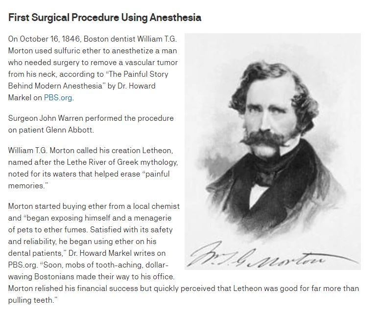 وتشير مقالات علميّة عدّة نشرت في مواقع تابعة لمؤسسات طبيّة عريقة أنّ طبيب الأسنان ويليام ت.ج. مورتون استخدم عام 1846 للمرّة الأولى مادة الـEther أو ما يعرف بالعربية بـ”الأثير الكبريتي” لتخدير مريضٍ كان بحاجة لعملية جراحية أجريت في مستشفى ماساتشوستس العام في بوسطن.