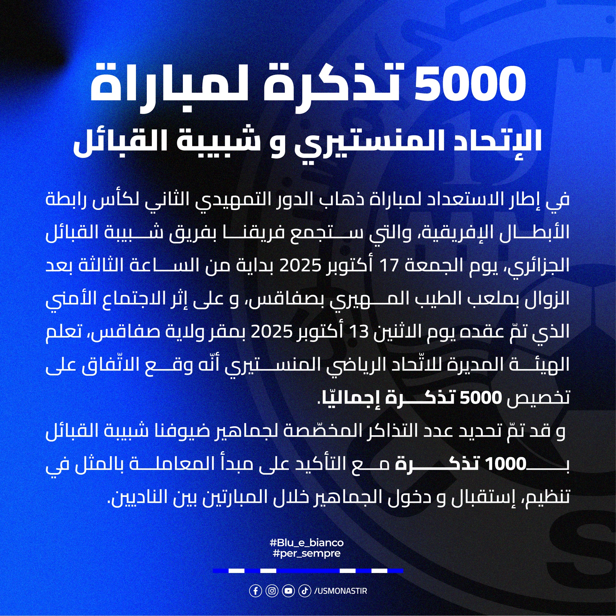 وأضافت إدارة الاتحاد المنستيري أنه تم تخصيص 1000 تذكرة لأنصار الشبيبة، مع التأكيد على مبدأ المعاملة بالمثل في تنظيم، واستقبال، ودخول الجماهير خلال مبارتي الذهاب والإياب.