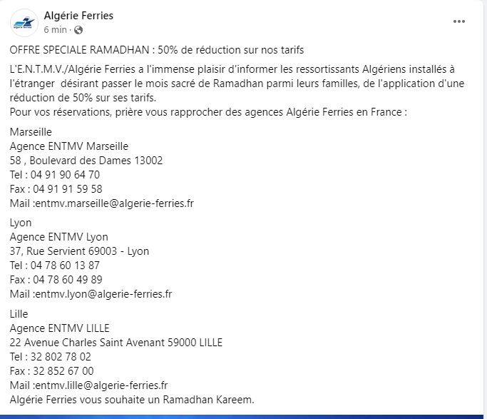 وفي بيان لها، أعلنت شركة النقل البحري، الثلاثاء، عن تطبيق قرار تخفيض أسعار التذاكر بنسبة 50 بالمائة، وهذا بالنسبة للزبائن الراغبين في قضاء شهر رمضان وسط العائلة.