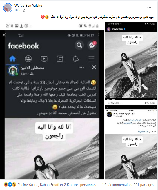 وأضافت التقارير أن الفتاة المغربية تدعى وفاء بن يعيش، وقد طلبت عبر حسابها الشخصي على فيسبوك بالكف عن تداول صورها على أنها لطالبة جزائرية توفيت بأوكرانيا.