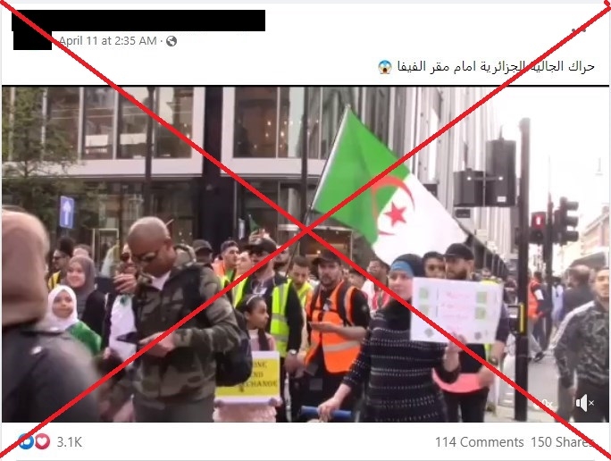 لكن الفيديو المتداول في هذا السياق للقول إنه يُظهر احتجاجات جزائريّة أمام مقرّ الفيفا في سويسرا، مصوّر في الحقيقة عام 2019 في بريطانيا.