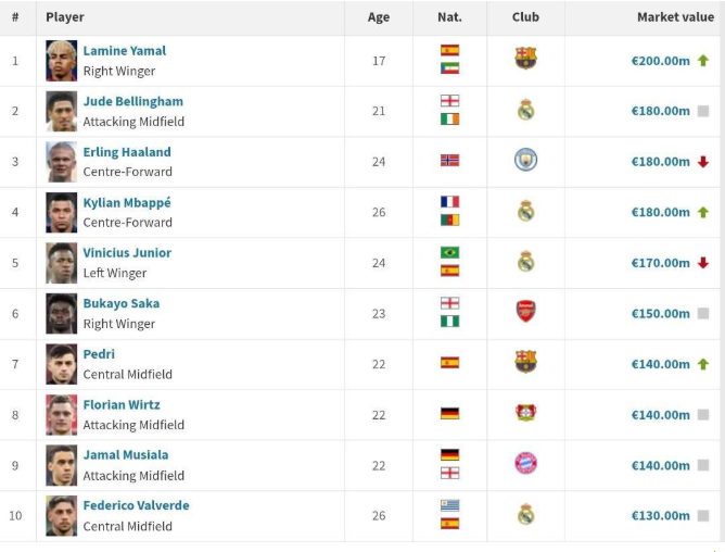 ففي تحديث جديد للقيم السوقية للاعبين، نشره موقع “ترانسفير ماركت” تفوق يامال على الفرنسي كيليان مبابي والبرازيلي فينيسيوس جونيور، بعد موسم استثنائي قدّمه بقميص برشلونة.