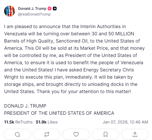 وكتب ترامب على منصة تروث سوشيال:”لقد طلبت من وزير الطاقة كريس رايت تنفيذ هذه الخطة فوراً. وسيتم نقل النفط عبر سفن تخزين، ثم يجلب مباشرة إلى أرصفة التفريغ في الولايات المتحدة”.