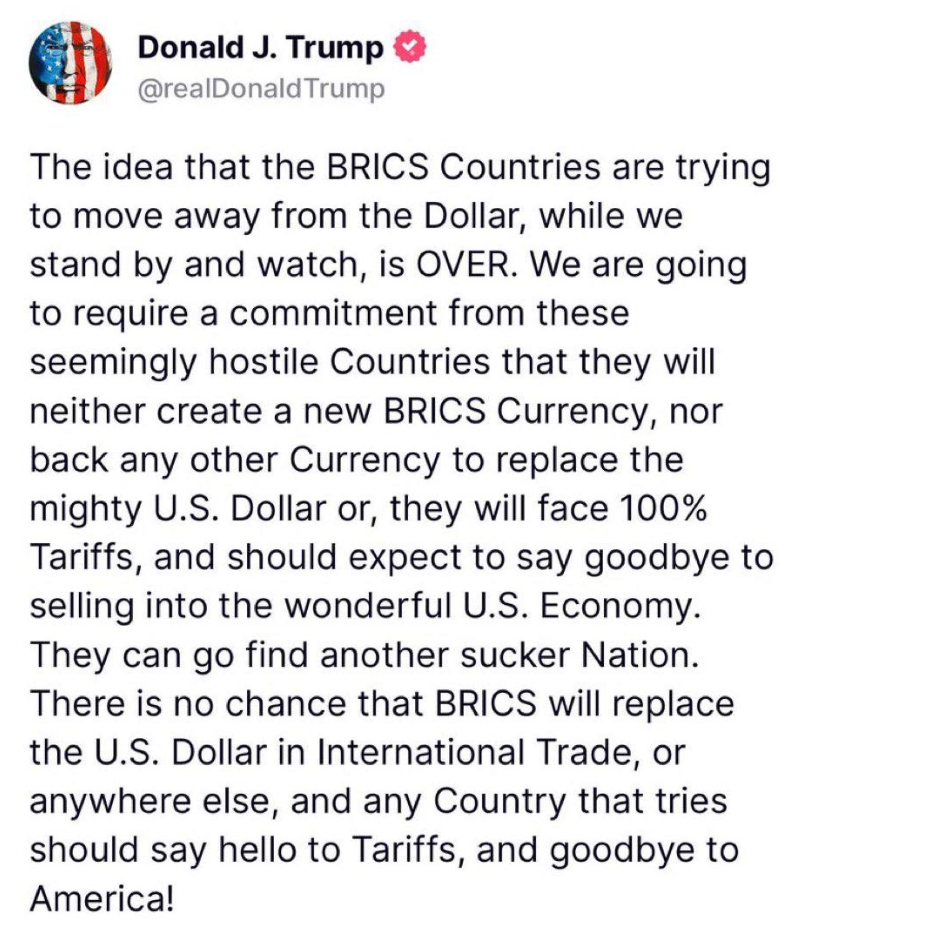 ترامب مهددا “بريكس”: الدولار أو مواجهة رسوم جمركية بنسبة 100%