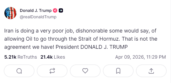 قال ترامب على منصته تروث سوشال “هناك تقارير تفيد بأن إيران تفرض رسوما على ناقلات النفط التي تمر عبر مضيق هرمز. من الأفضل ألا تفعل ذلك، وإذا كانت تقوم بذلك، فمن الأفضل أن تتوقف الآن!”.
