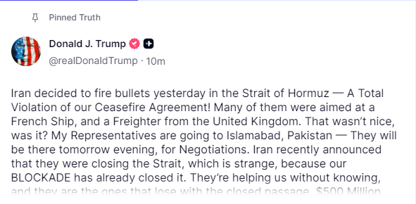 أعلن الرئيس الأميركي دونالد ترامب أن ممثلي الولايات المتحدة سيتوجهون إلى إسلام آباد، الاثنين، لإجراء محادثات مع طهران.