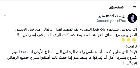 ونشر ترامب، مساء الإثنين، تدوينة على موقع “تروث سوشيال” قال فيها: “قرأتُ للتو تقريرا إخباريا يفيد بأن حماس نقلت الرهائن إلى خارج الأرض لاستخدامهم كدروع بشرية ضد الهجوم البري الإسرائيلي”، وهو ما اعتبرته الحركة انحيازًا فجًا لرواية الاحتلال وتغطية على حرب الإبادة المتواصلة ضد المدنيين.