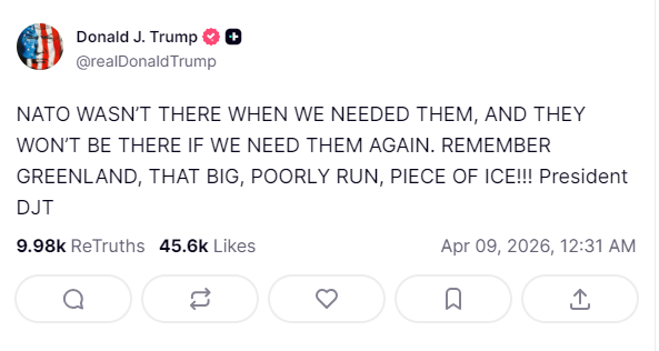 ونشر ترامب تدوينة عبر منصة “تروث سوشيال جاء فيها: “لم يكن حلف الناتو موجودا عندما احتجنا إليه، ولن يكون موجودا إذا احتجنا إليه مرة أخرى. تذكّروا غرينلاند، تلك القطعة الكبيرة من الجليد التي تدار بشكل سيئ”.