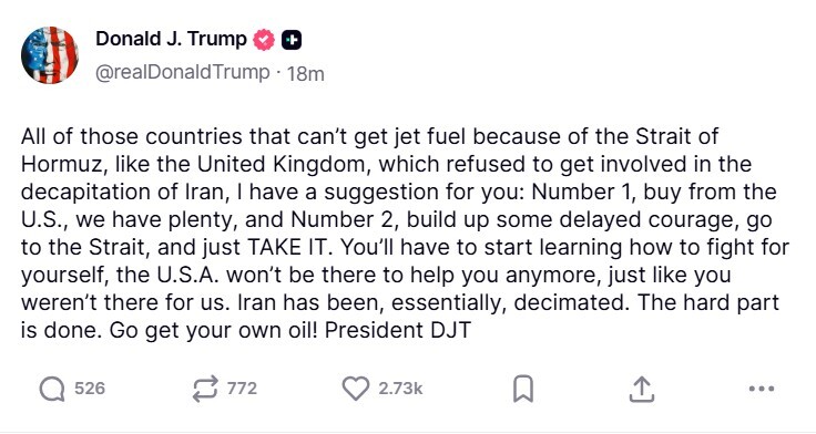 وقال ترامب في منشور عبر منصته “تروث سوشيال” للتواصل الاجتماعي إن “بريطانيا من بين الدول التي لم تعد قادرة على الحصول على وقود الطائرات بسبب إغلاق مضيق هرمز، مشيرا إلى أنها رفضت المشاركة في عملية قطع رأس النظام الإيراني”.