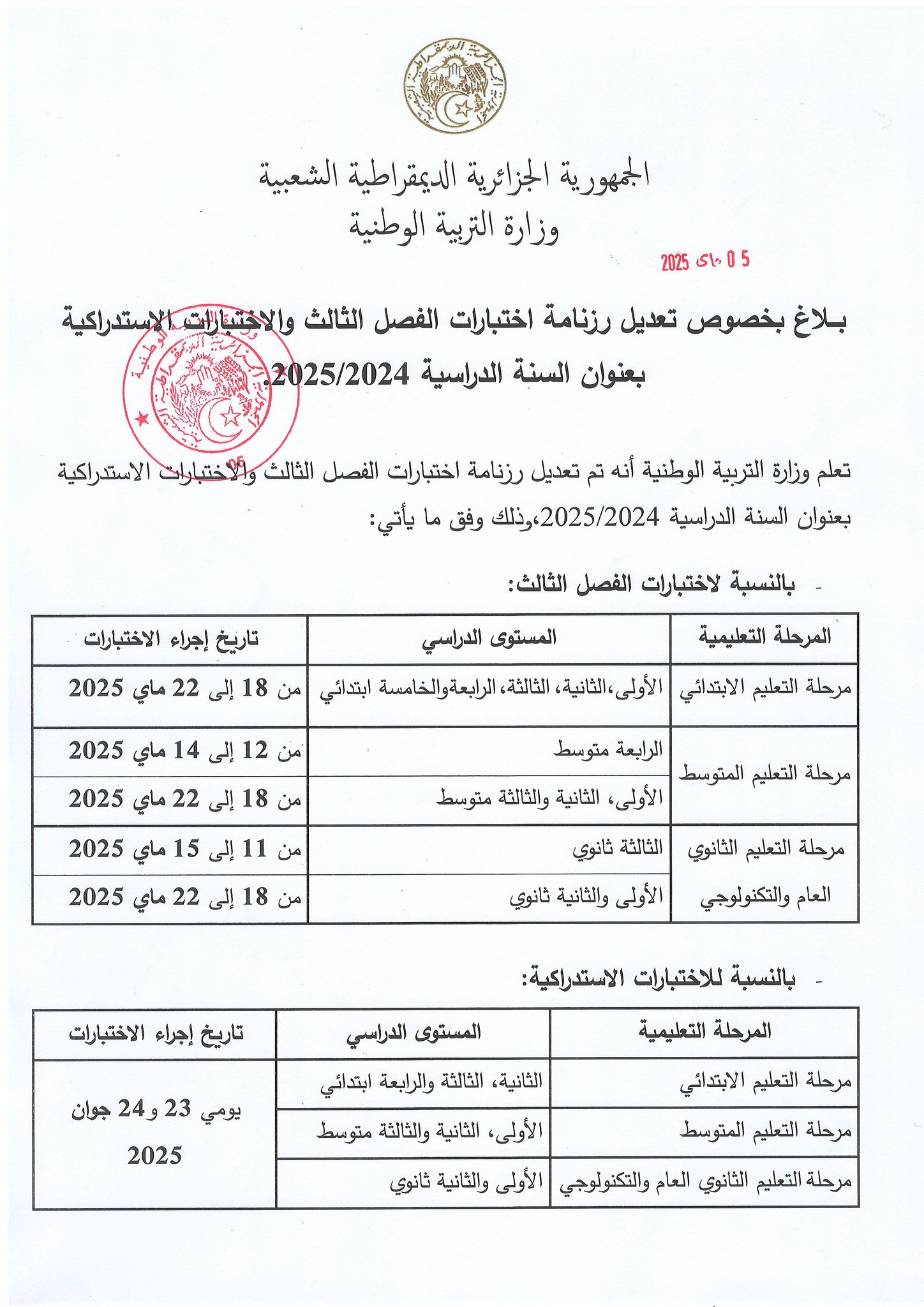 وكان قد تم برمجة اختبارات الفصل الثالث والأخير في الفترة بين 25 و 29 ماي 2024 لكل سنوات الابتدائي، وأيضا سنوات الأولى والثانية والثالثة متوسط ،وسنوات الأولى والثانية ثانوي.